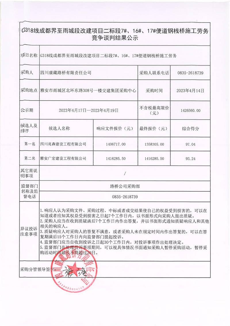 四川康藏路橋有限責(zé)任公司G318線(xiàn)成都至雨城段改建項(xiàng)目二標(biāo)段7#、16#、17#便道鋼棧橋施工勞務(wù)競(jìng)爭(zhēng)談判結(jié)果公示