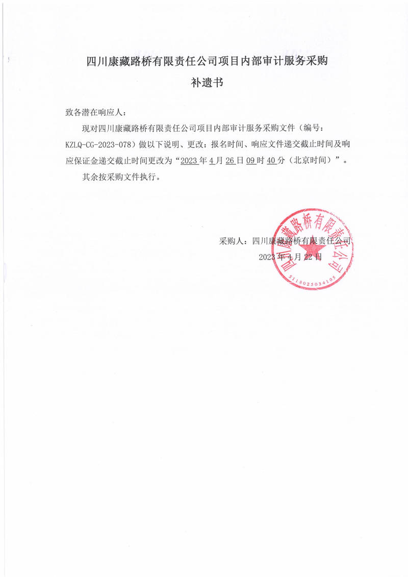 四川康藏路橋有限責任公司項目內(nèi)部審計服務(wù)采購補遺書