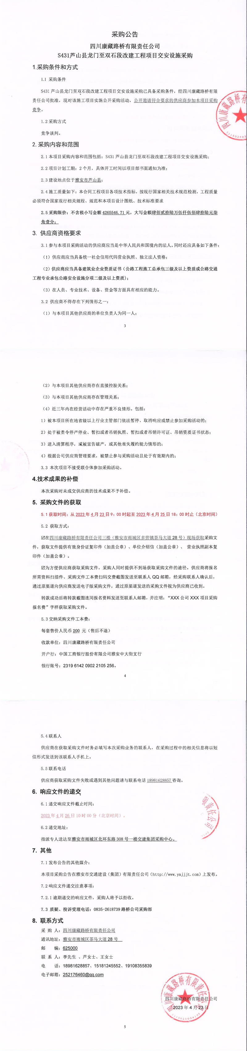 四川康藏路橋有限責任公司S431蘆山縣龍門至雙石段改建工程項目交安設(shè)施采購