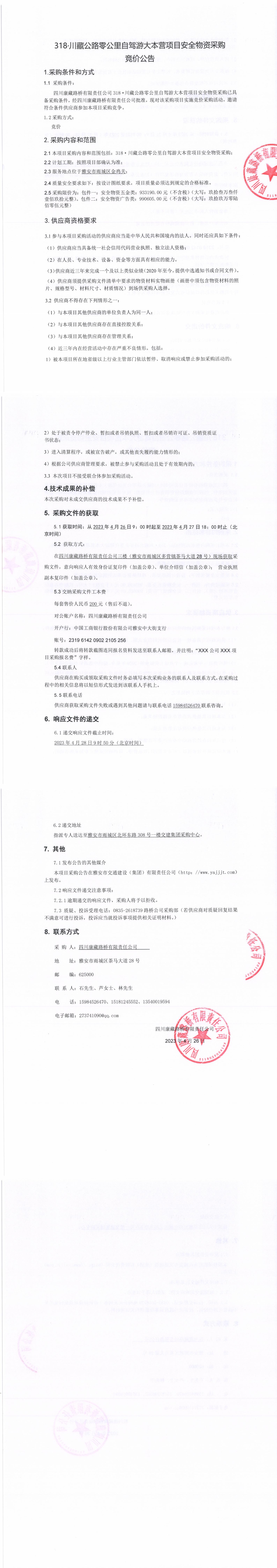 四川康藏路橋有限責(zé)任公司318·川藏公路零公里自駕游大本營項目安全物資采購競價公告