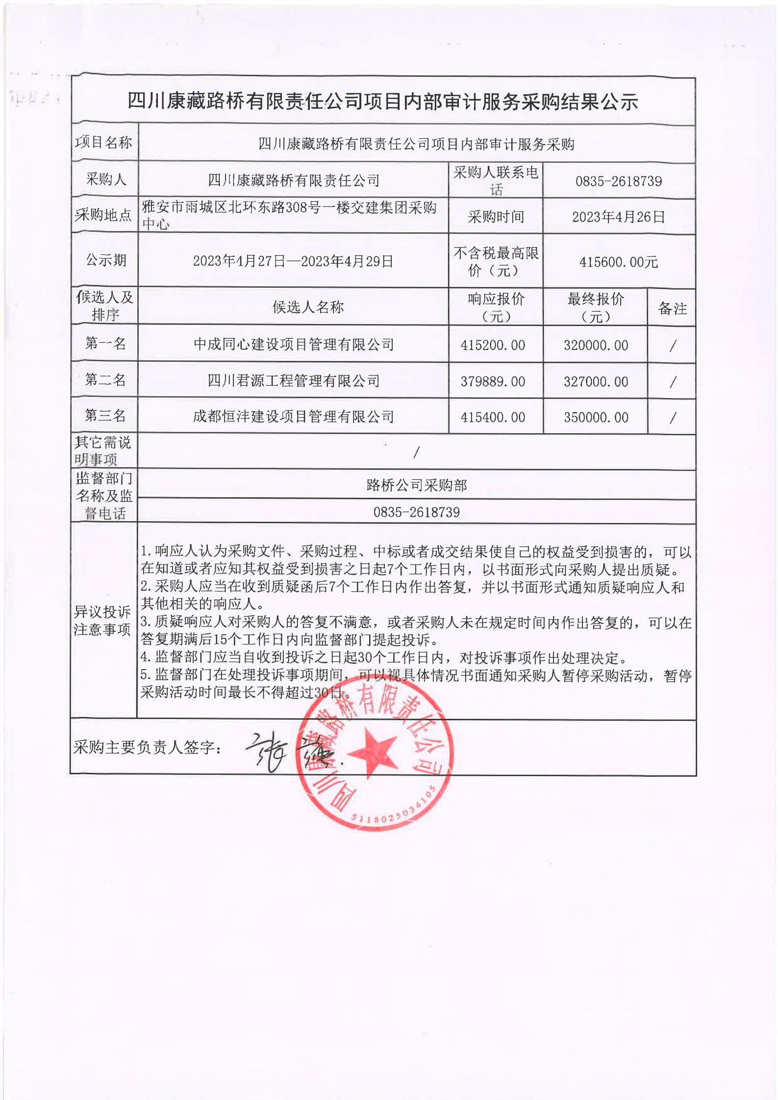 四川康藏路橋有限責(zé)任公司項(xiàng)目內(nèi)部審計(jì)服務(wù)采購結(jié)果公示