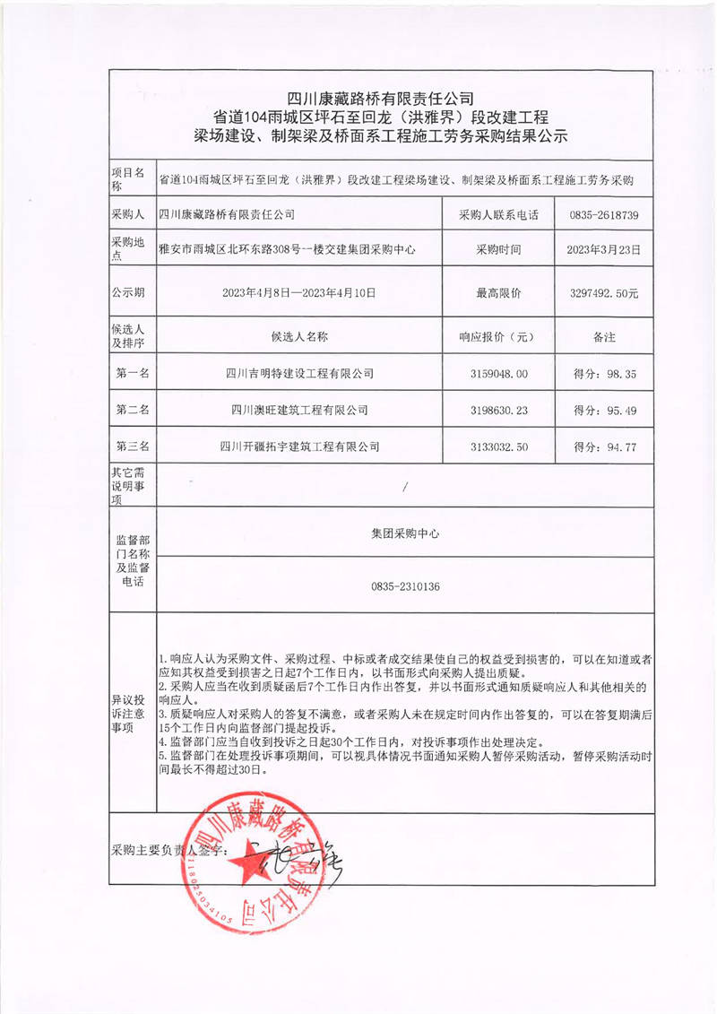 四川康藏路橋有限責任公司省道104雨城區(qū)坪石至回龍(洪雅界)段改建工程梁場建設(shè)、制架梁及橋面系工程施工勞務(wù)采購結(jié)果公示