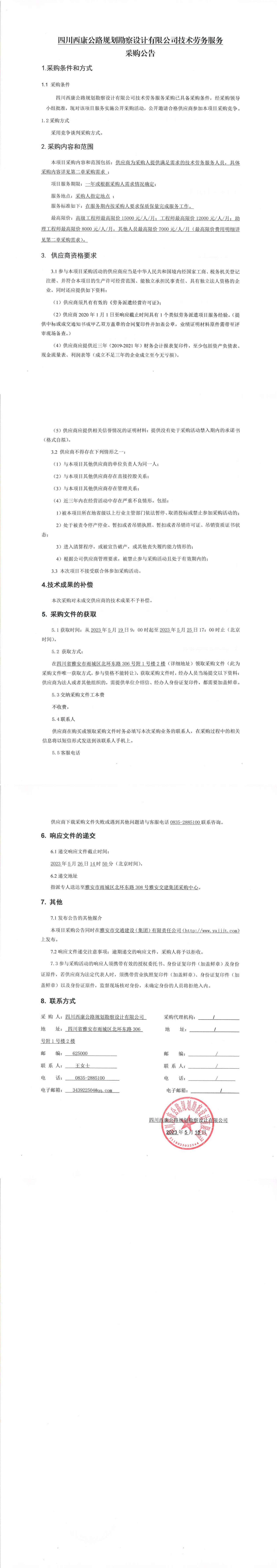 四川西康公路規(guī)劃勘察設計有限公司技術勞務服務采購公告