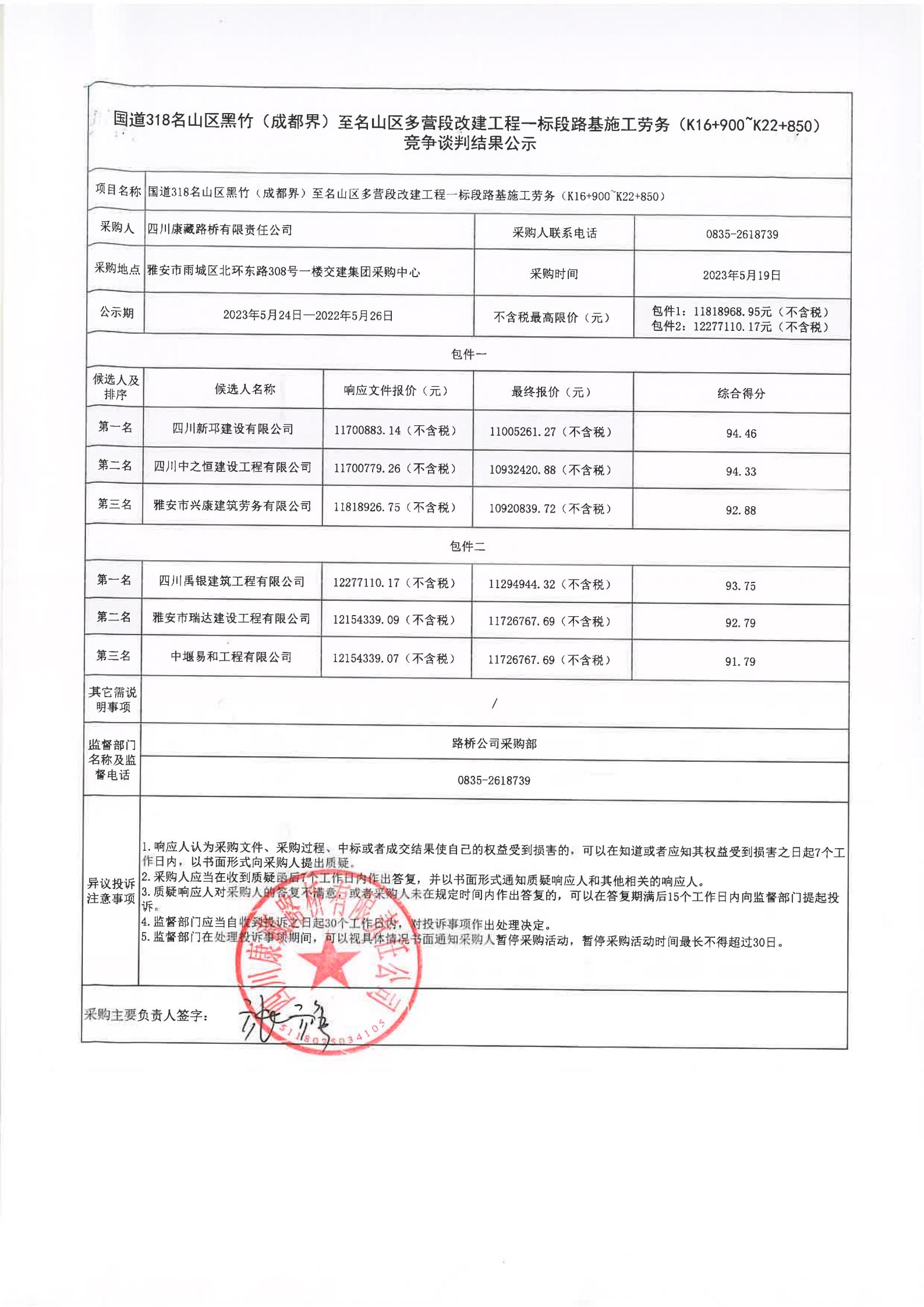 四川康藏路橋有限責(zé)任公司國(guó)道318名山區(qū)黑竹(成都界)至雨城區(qū)多營(yíng)段改建工程一標(biāo)段路基施工勞務(wù)(K22+850~K26+604.5)競(jìng)爭(zhēng)談判結(jié)果公示