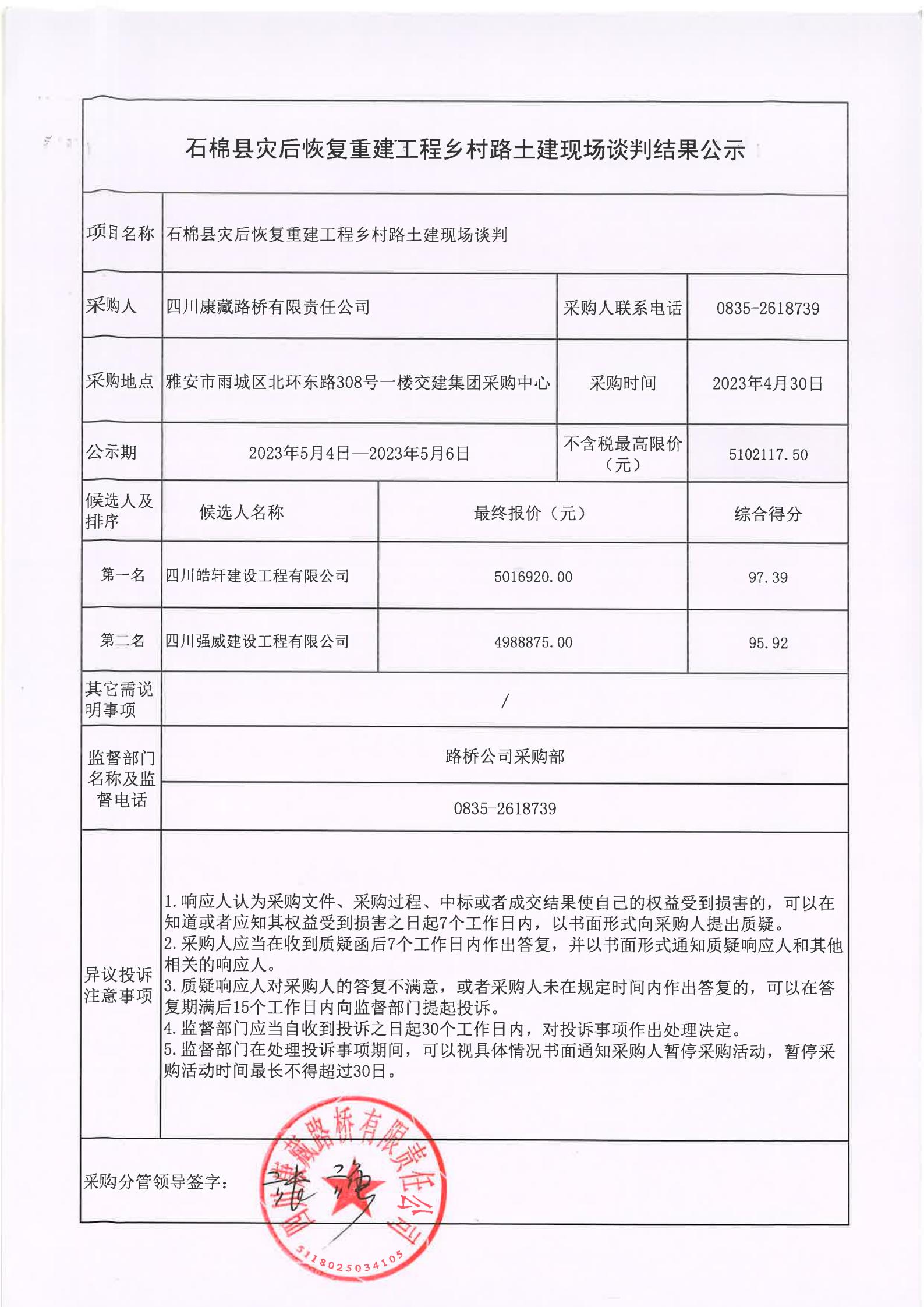 四川康藏路橋有限責(zé)任公司石棉縣災(zāi)后恢復(fù)重建工程鄉(xiāng)村路土建現(xiàn)場(chǎng)談判結(jié)果公示