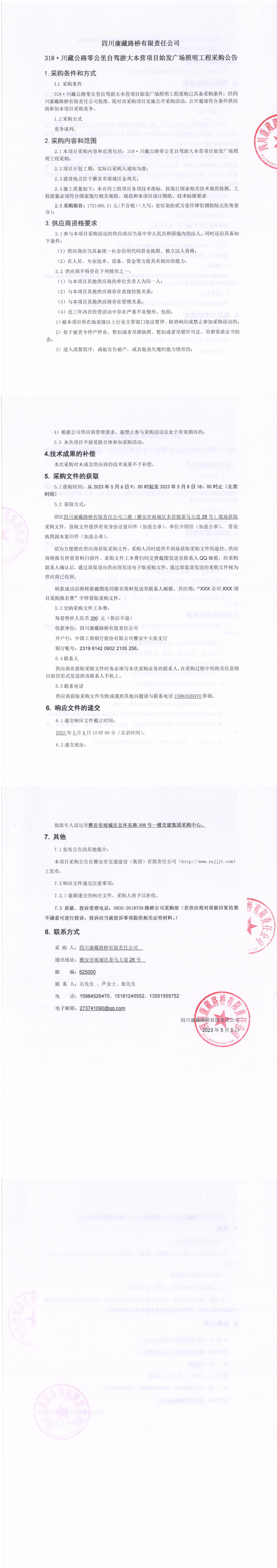四川康藏路橋有限責(zé)任公司318·川藏公路零公里自駕游大本營項目始發(fā)廣場照明工程采購公告