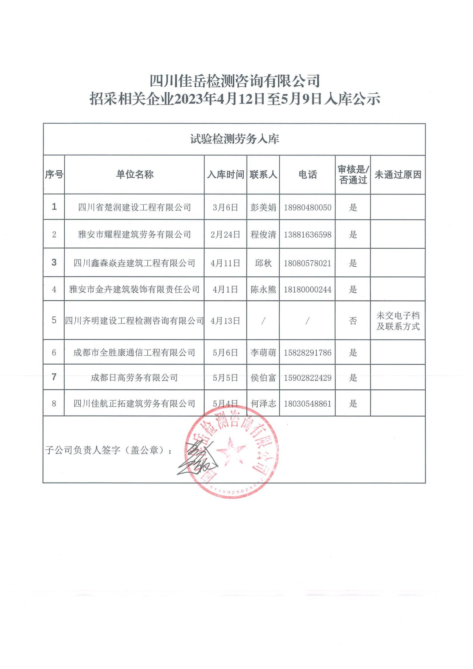 四川佳岳檢測咨詢有限公司(試驗檢測勞務供應商庫)2023年4月12日至5月9日入庫結(jié)果公示