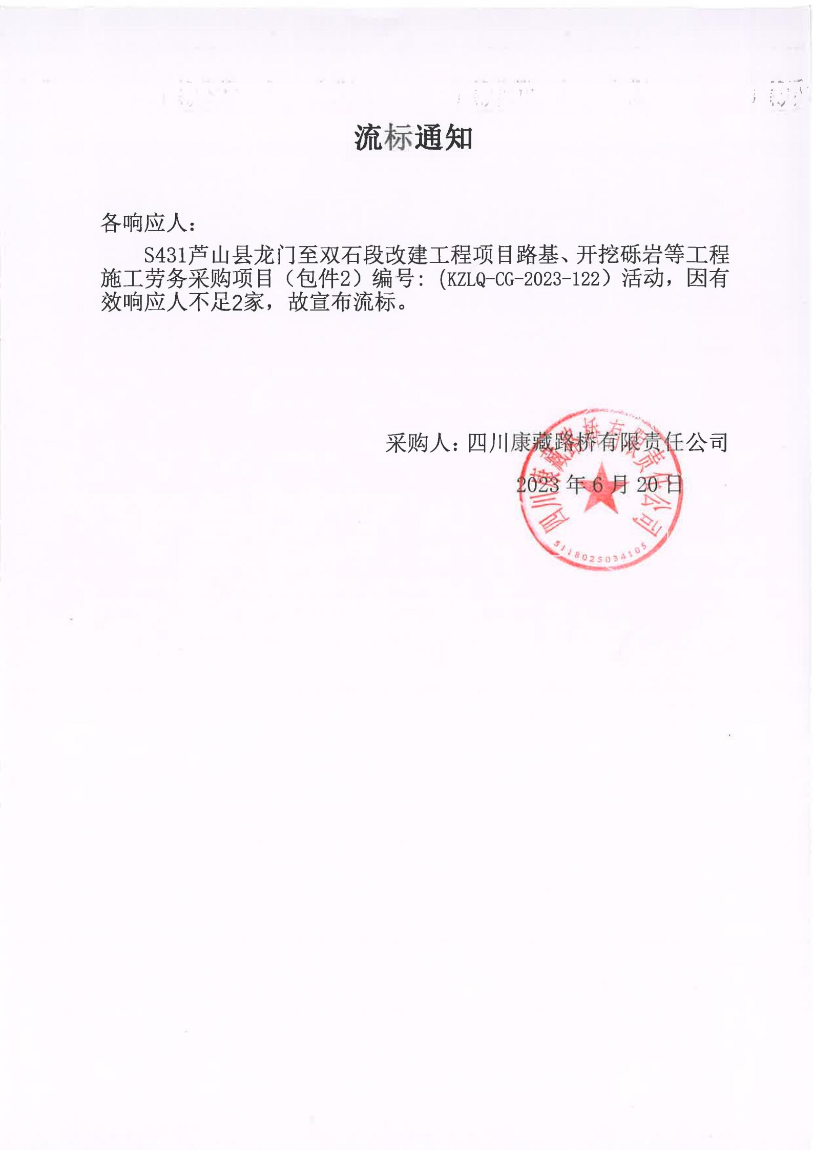 四川康藏路橋有限責(zé)任公司S431蘆山縣龍門至雙石段改建工程項(xiàng)目路基、開(kāi)挖礫巖等工程施工勞務(wù)采購(gòu)(包件2)流標(biāo)通知