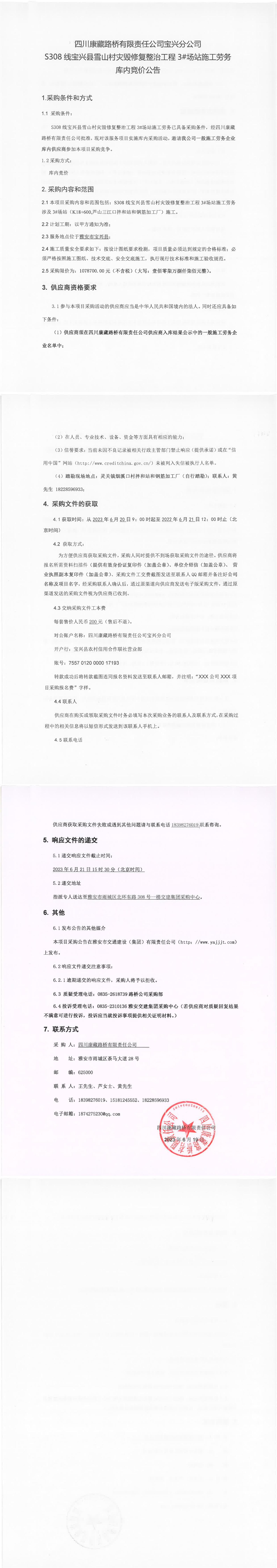四川康藏路橋有限責任公司寶興分公司S308線寶興縣雪山村災毀整治工程3#場站施工勞務庫內(nèi)競價公告