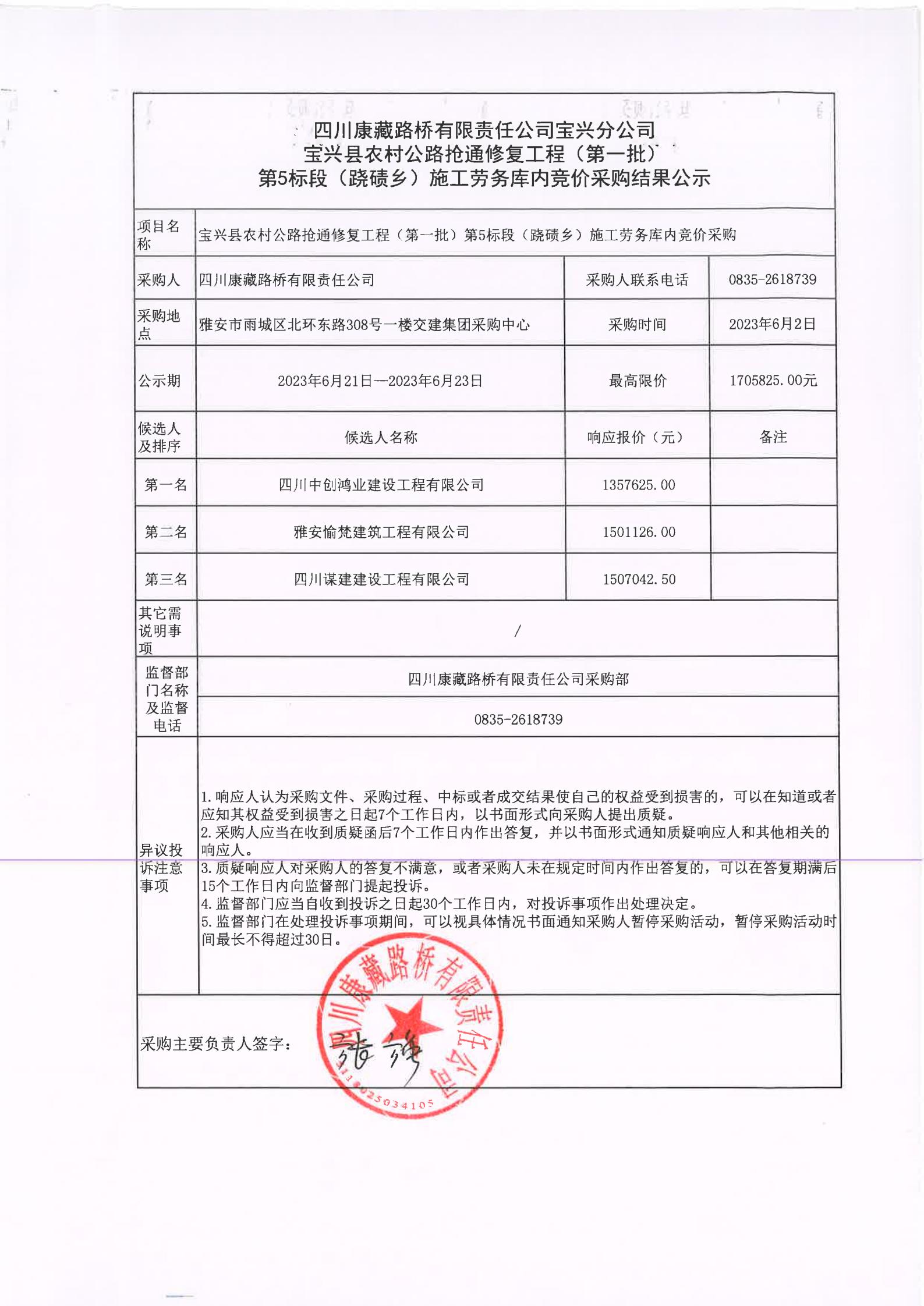 四川康藏路橋有限責(zé)任公司寶興分公司寶興縣農(nóng)村公路搶通修復(fù)工程(第一批)第5標(biāo)段(蹺磧鄉(xiāng))施工勞務(wù)庫內(nèi)競價(jià)采購結(jié)果公示