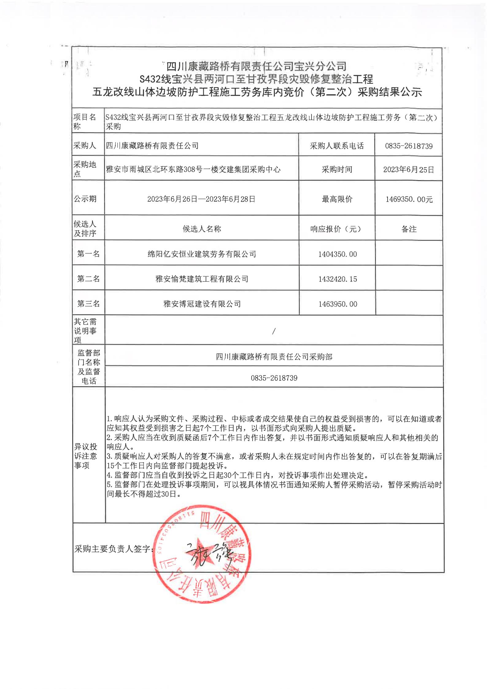 四川康藏路橋有限責任公司寶興分公司S432寶興縣兩河口至甘孜界段災(zāi)毀修復(fù)整治工程五龍改線山體邊坡防護工程施工勞務(wù)庫內(nèi)競價(第二次)結(jié)果公示