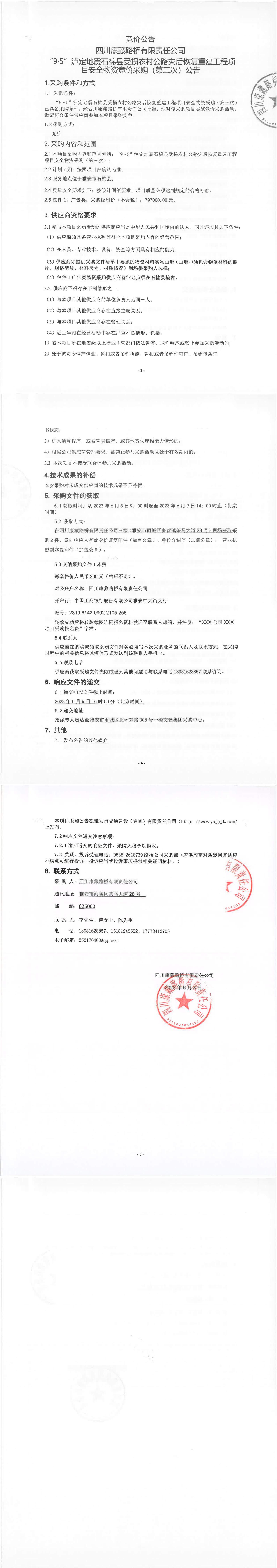 四川康藏路橋有限責(zé)任公司“9·5”瀘定地震石棉縣受損農(nóng)村公路災(zāi)后恢復(fù)重建工程項(xiàng)目安全物資競(jìng)價(jià)采購(第三次)公告