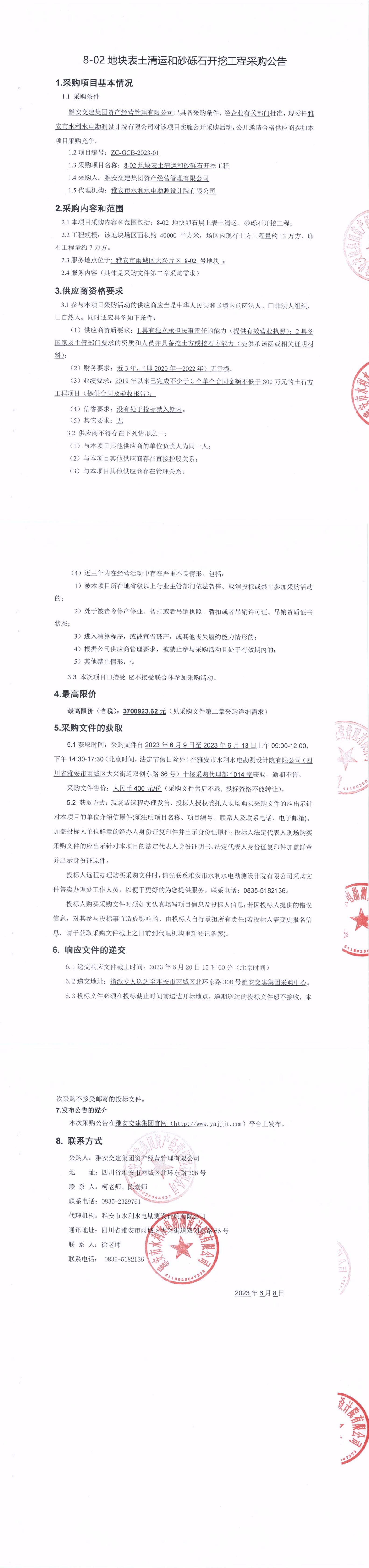 雅安交建集團資產(chǎn)經(jīng)營管理有限公司8-02地塊表土清運和砂礫石開挖工程采購公告