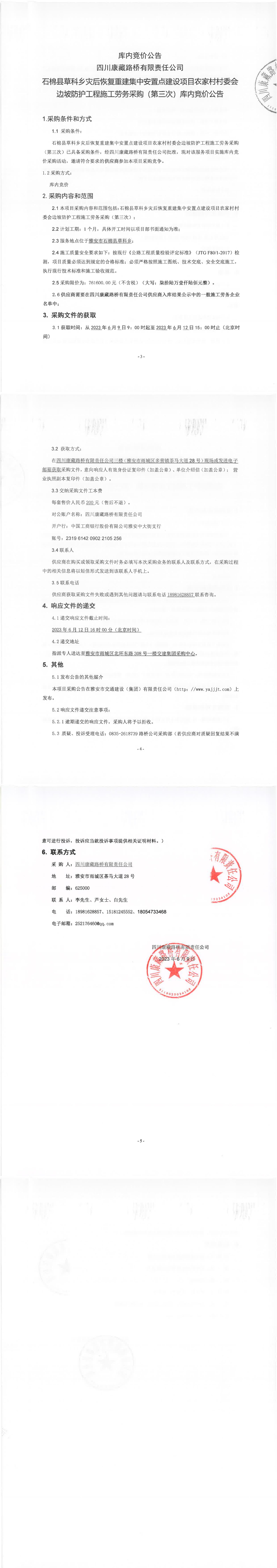 四川康藏路橋有限責(zé)任公司石棉縣草科鄉(xiāng)災(zāi)后恢復(fù)重建集中安置點(diǎn)建設(shè)項目農(nóng)家村村委會邊坡防護(hù)工程施工勞務(wù)采購(第三次)庫內(nèi)競價公告