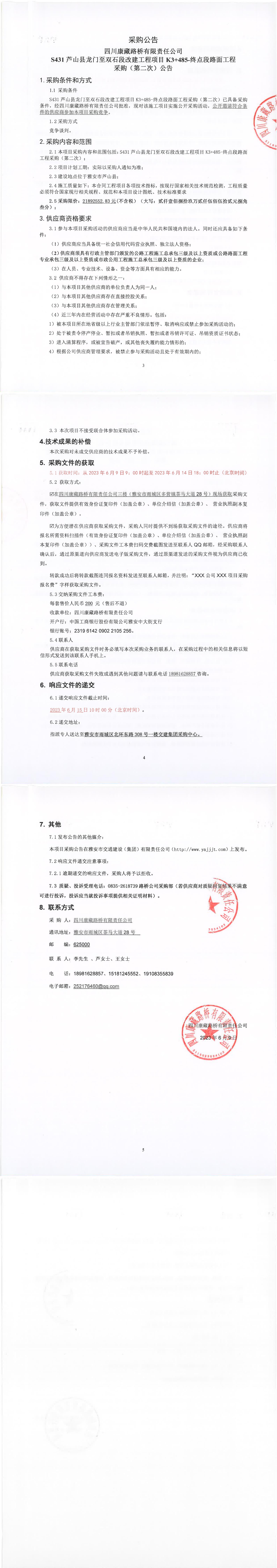 四川康藏路橋有限責(zé)任公司S431蘆山縣龍門至雙石段改建工程項目K3+485-終點段路面工程采購(第二次)公告