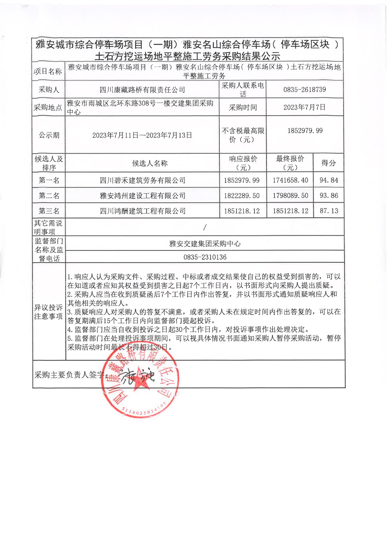 四川康藏路橋有限責(zé)任公司雅安城市綜合停車場(chǎng)項(xiàng)目(一期)雅安名山綜合停車場(chǎng)(停車場(chǎng)區(qū)塊)土石方挖運(yùn)場(chǎng)地平整施工勞務(wù)采購結(jié)果公示
