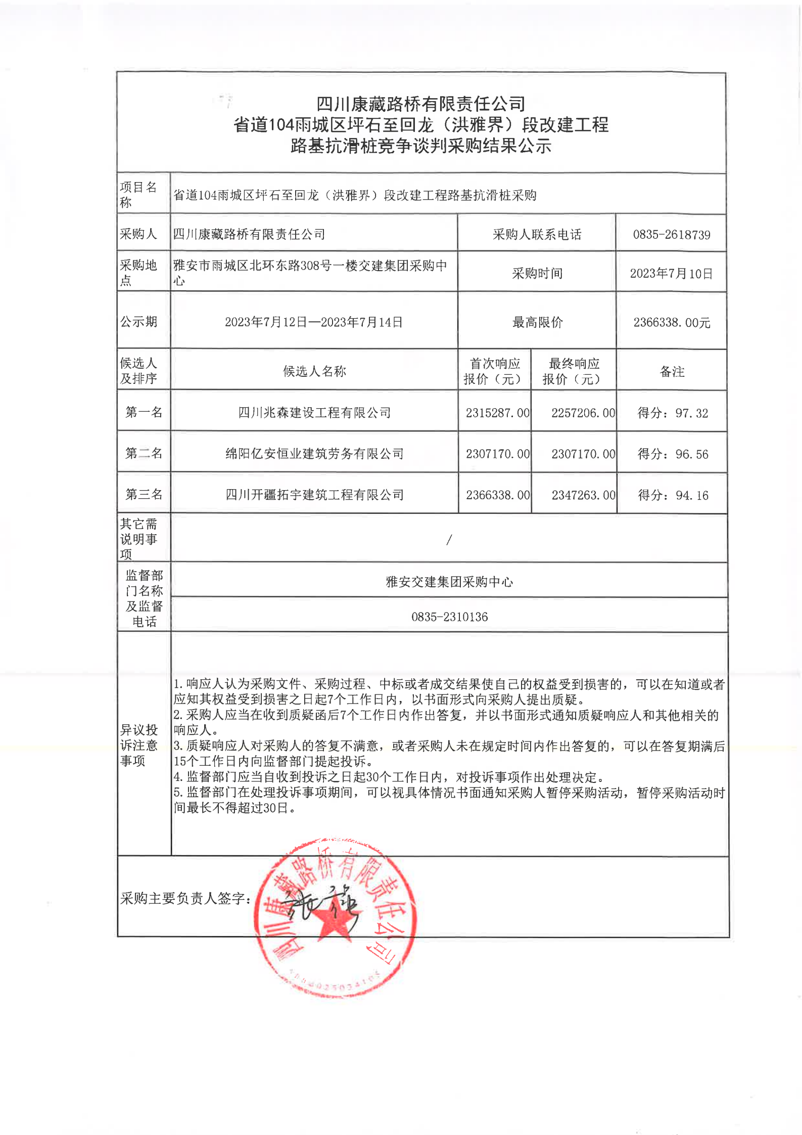 四川康藏路橋有限責任公司省道104雨城區(qū)坪石至回龍(洪雅界)段改建工程路基抗滑樁競爭談判采購結(jié)果公示