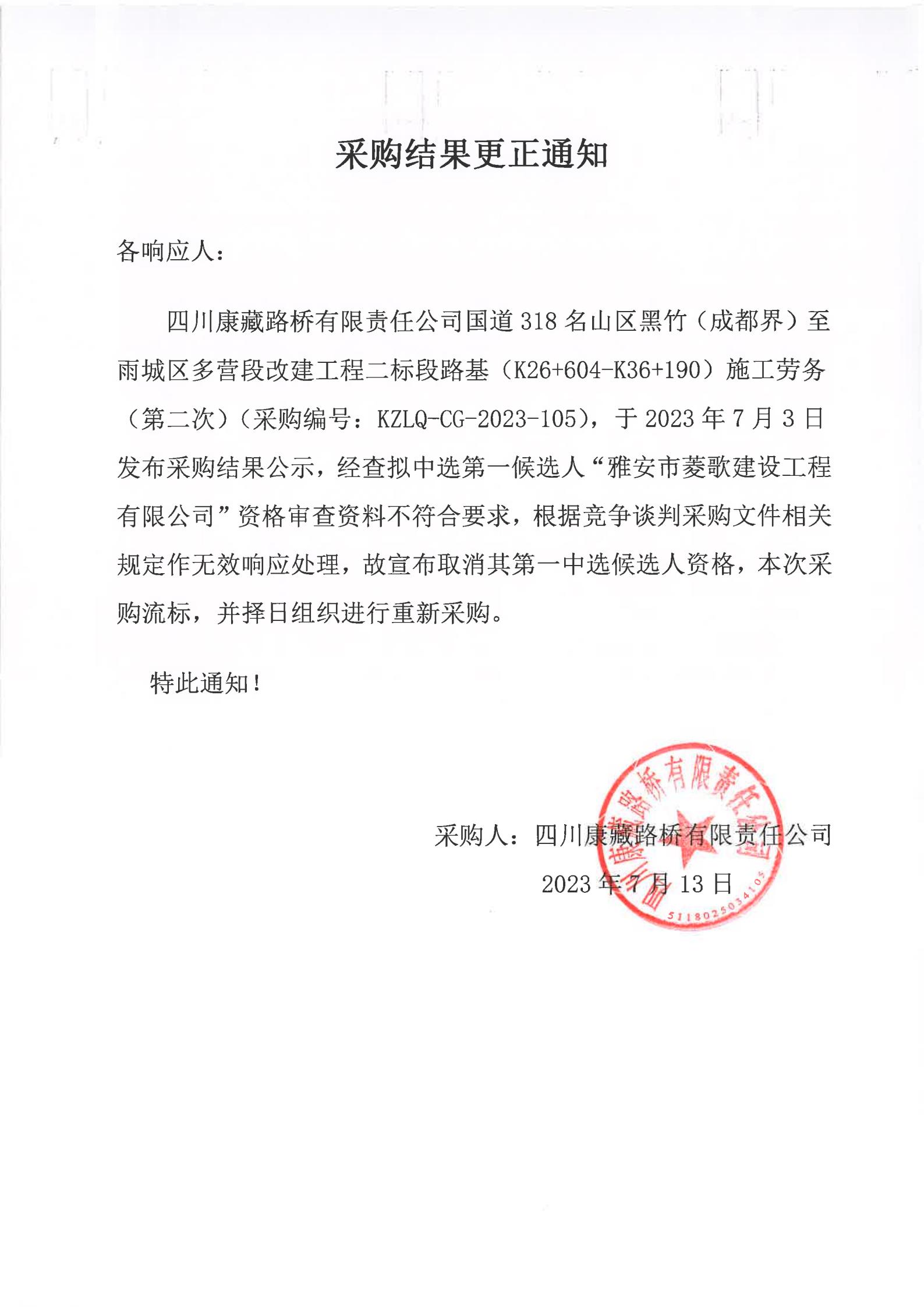 四川康藏路橋有限責任公司國道318名山區(qū)黑竹(成都界)至雨城區(qū)多營段改建工程二標段路基(K26+604-K36+190)施工勞務(第二次)采購結果更正通知