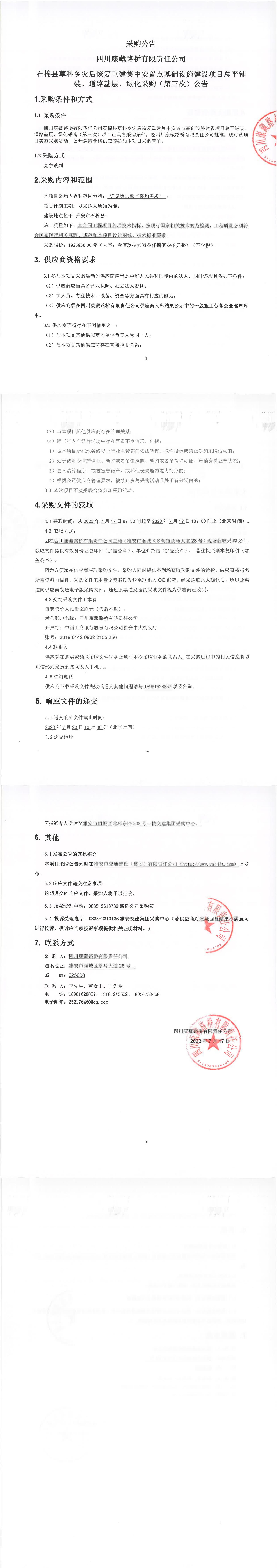 四川康藏路橋有限責(zé)任公司石棉縣草科鄉(xiāng)災(zāi)后恢復(fù)重建集中安置點基礎(chǔ)設(shè)施建設(shè)項目總平鋪裝、道路基層、綠化采購(第三次)公告