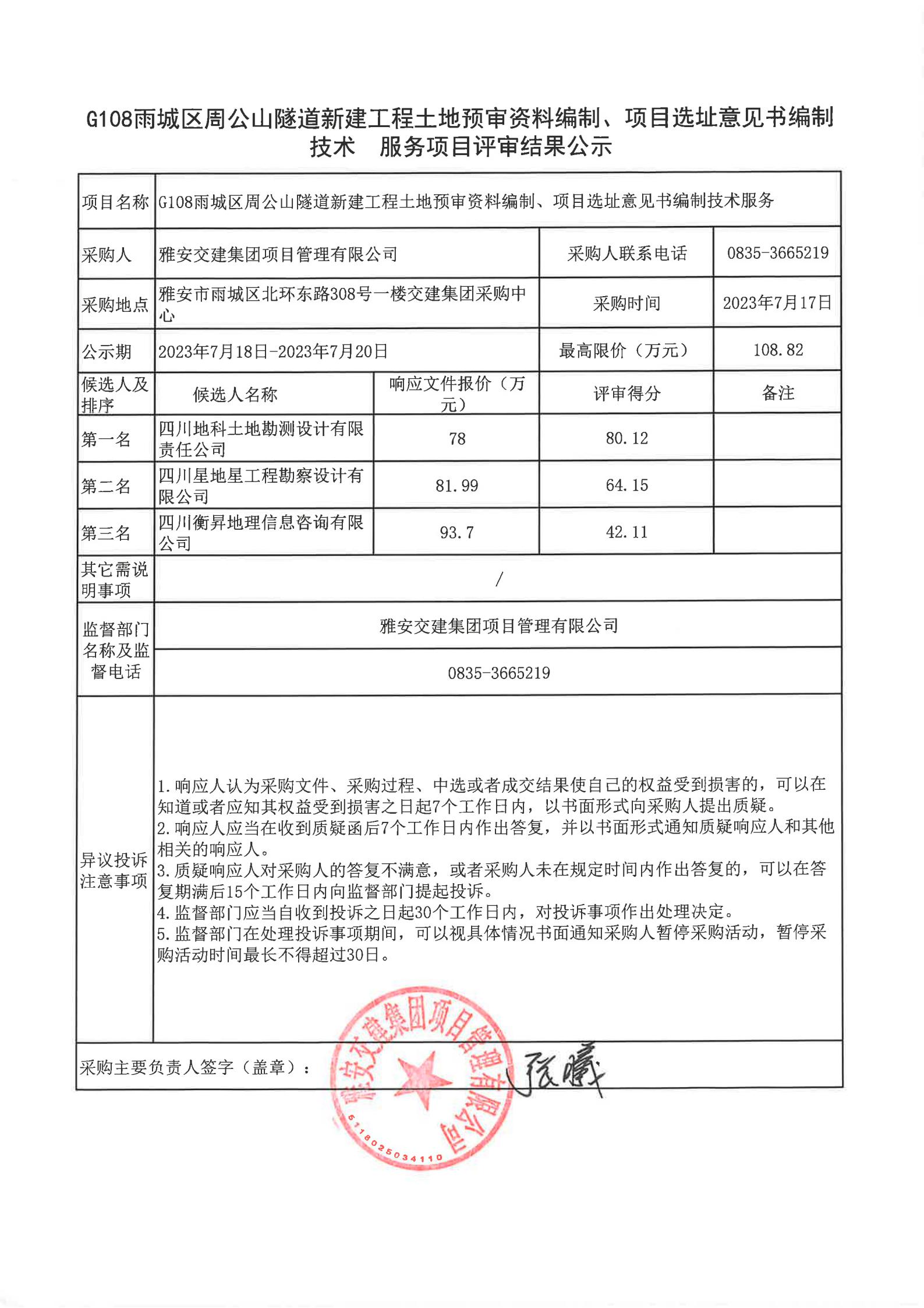 雅安交建集團(tuán)項(xiàng)目管理有限公司G108雨城區(qū)周公山隧道新建工程土地預(yù)審資料編制、項(xiàng)目選址意見(jiàn)書編制技術(shù)服務(wù)項(xiàng)目評(píng)審結(jié)果公示