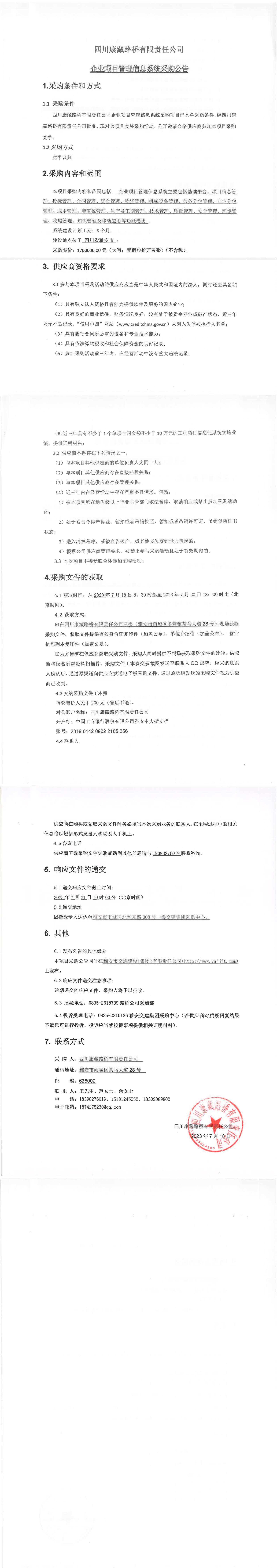 四川康藏路橋有限責(zé)任公司企業(yè)項目管理信息系統(tǒng)采購公告