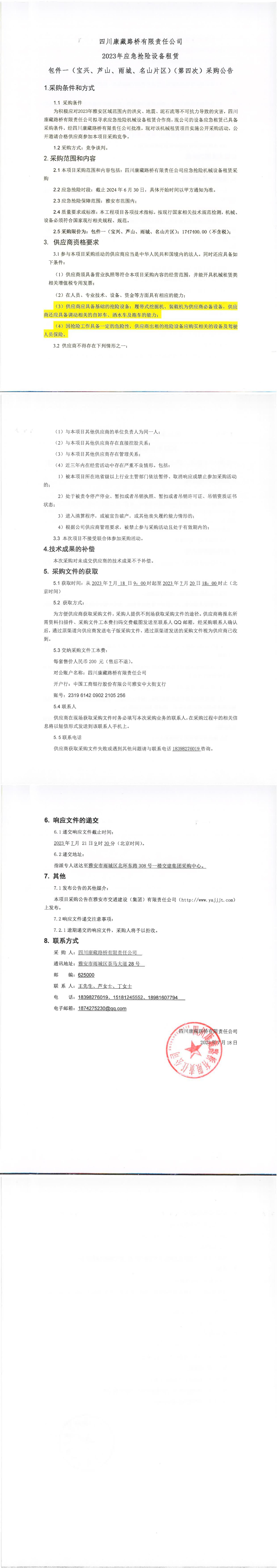 四川康藏路橋有限責任公司2023年應急搶險設備租賃包件一(寶興、蘆山、雨城、名山片區(qū))(第四次)采購公告