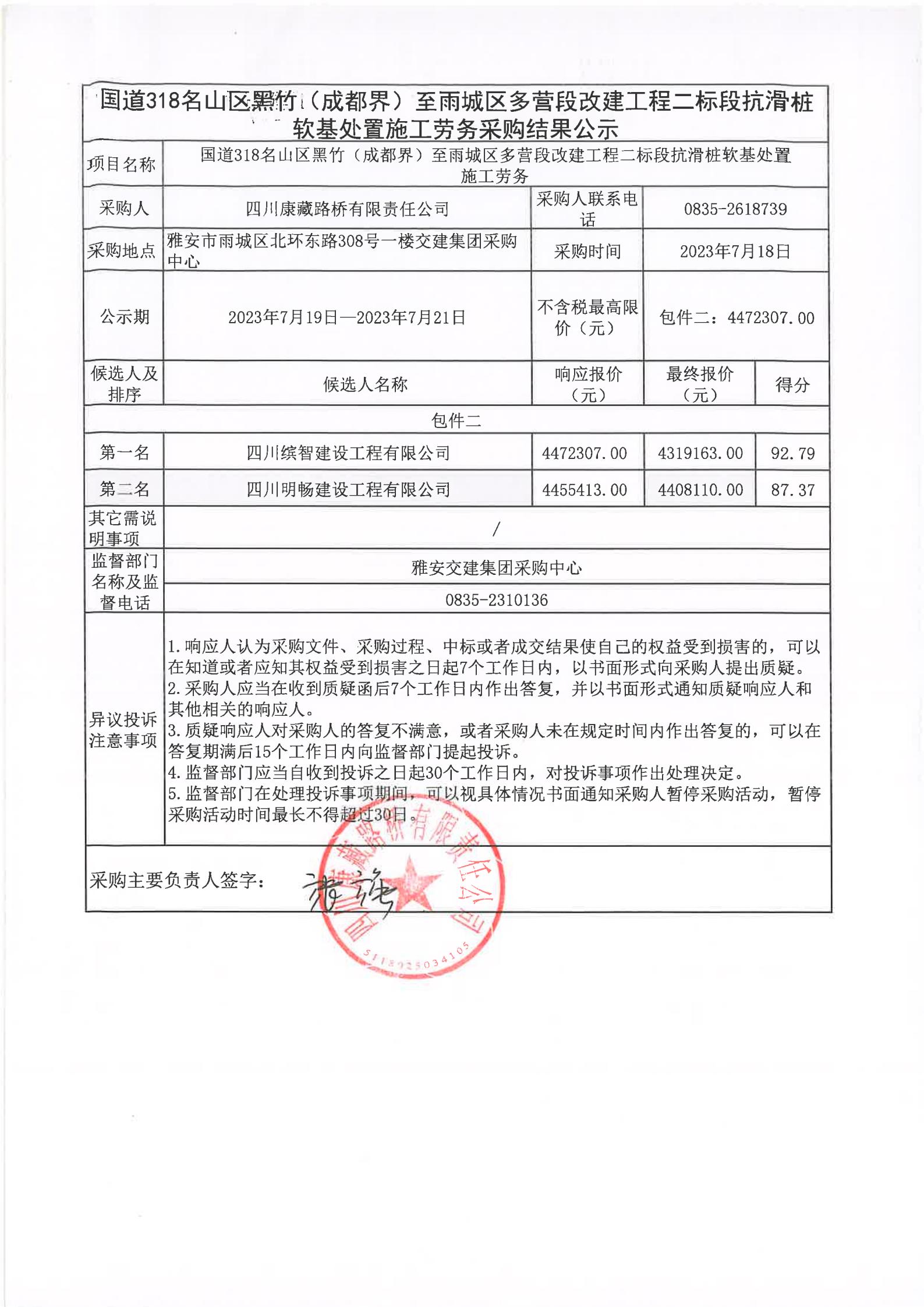 四川康藏路橋有限責(zé)任公司國(guó)道318名山區(qū)黑竹(成都界)至雨城區(qū)多營(yíng)段改建工程二標(biāo)段抗滑樁軟基處置施工勞務(wù)采購(gòu)結(jié)果公示