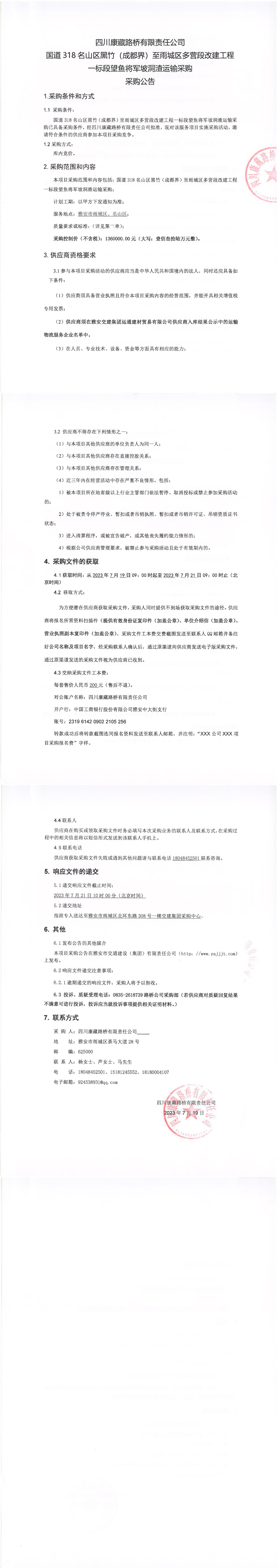 四川康藏路橋有限責任公司國道318名山區(qū)黑竹(成都界)至雨城區(qū)多營段改建工程一標段望魚將軍坡洞渣運輸采購公告