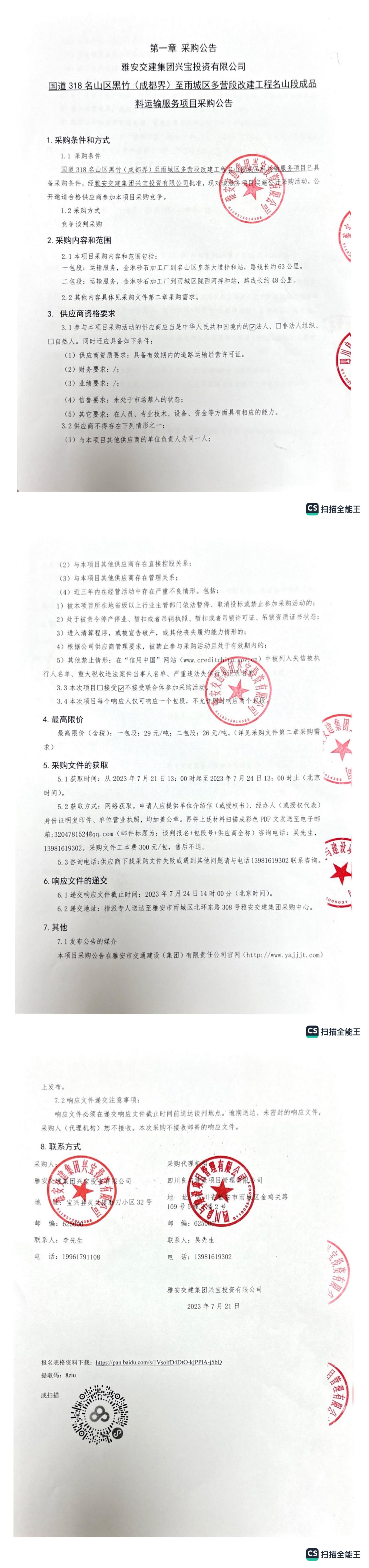 雅安交建集團興寶投資有限公司國道318名山區(qū)黑竹(成都界)至雨城區(qū)多營段改建工程名山段成品料運輸服務項目采購公告