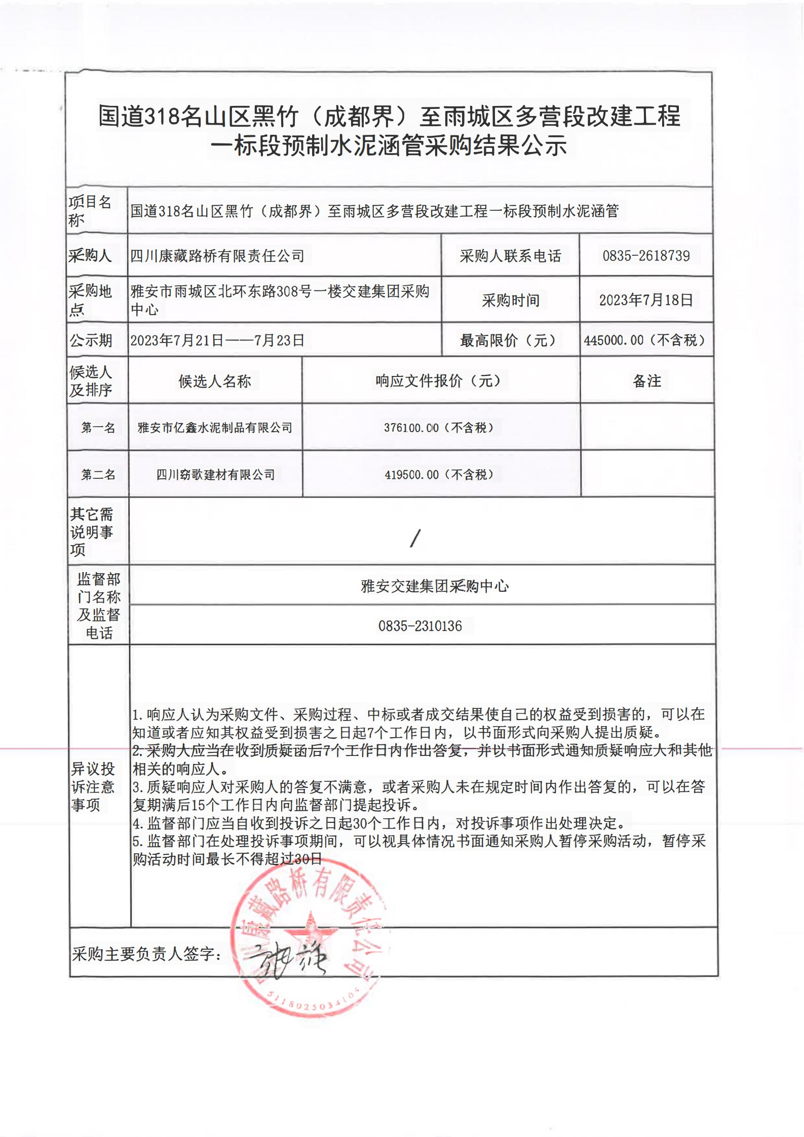 四川康藏路橋有限責任公司國道318名山區(qū)黑竹(成都界)至雨城區(qū)多營段改建工程一標段預制水泥涵管采購結果公示