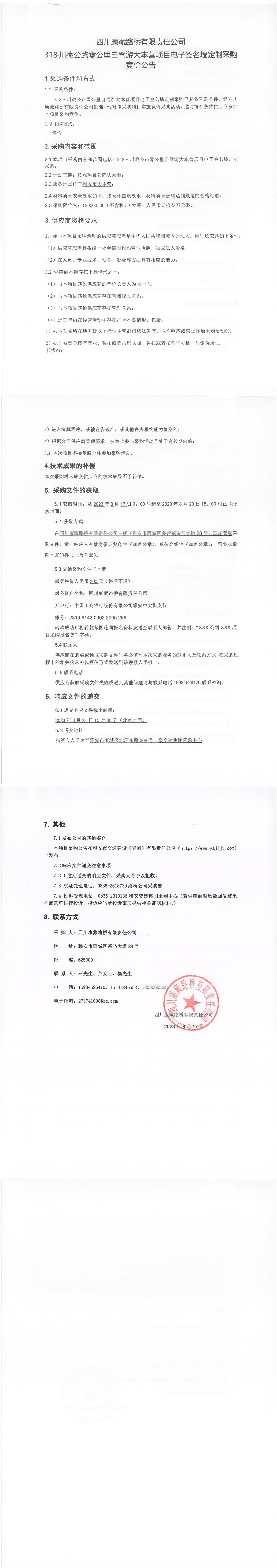 四川康藏路橋有限責任公司318·川藏公路零公里自駕游大本營項目電子簽名墻定制采購競價公告