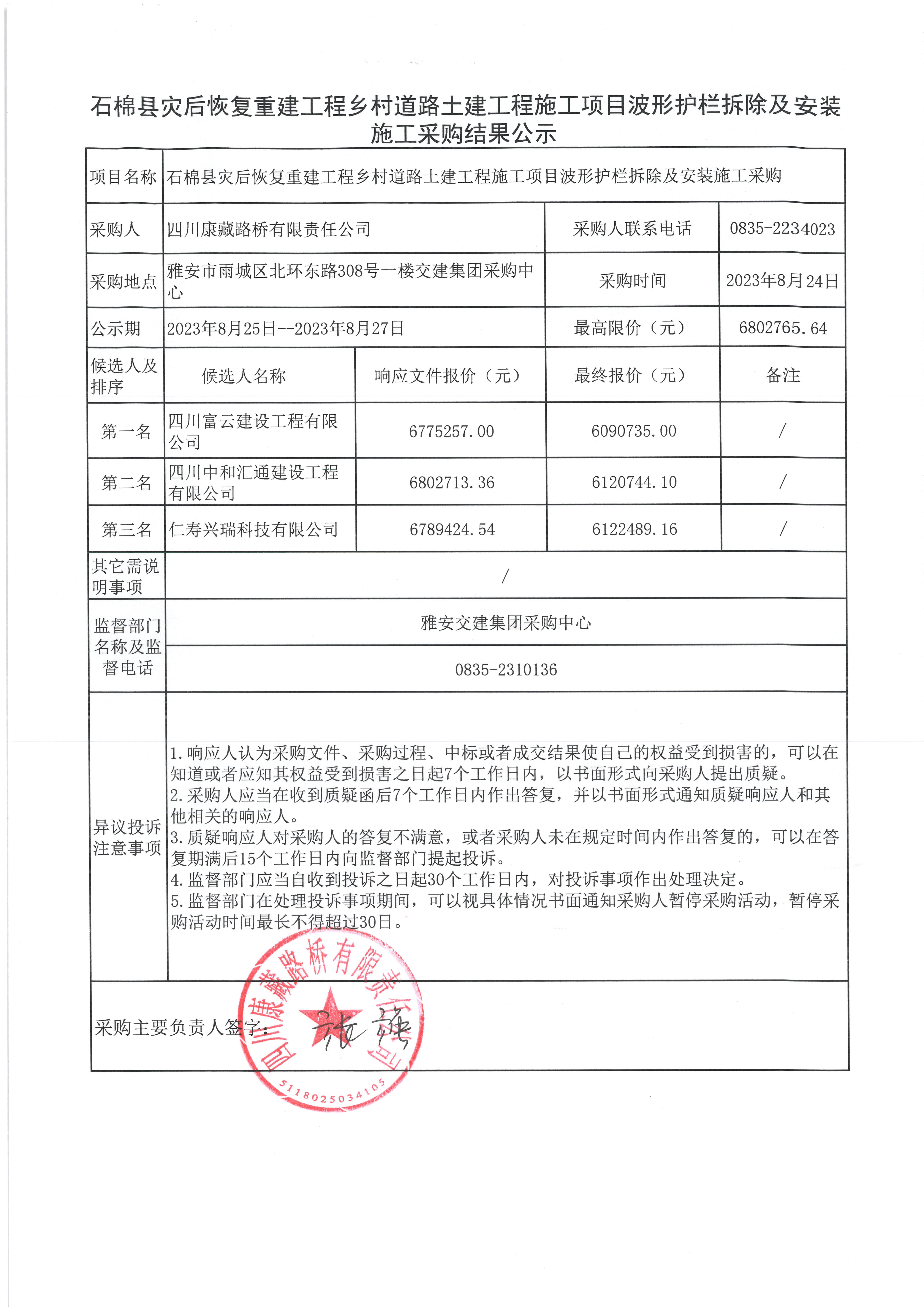石棉縣災(zāi)后恢復(fù)重建工程鄉(xiāng)村道路土建工程施工項(xiàng)目波形護(hù)欄拆除及安裝施工采購結(jié)果公示