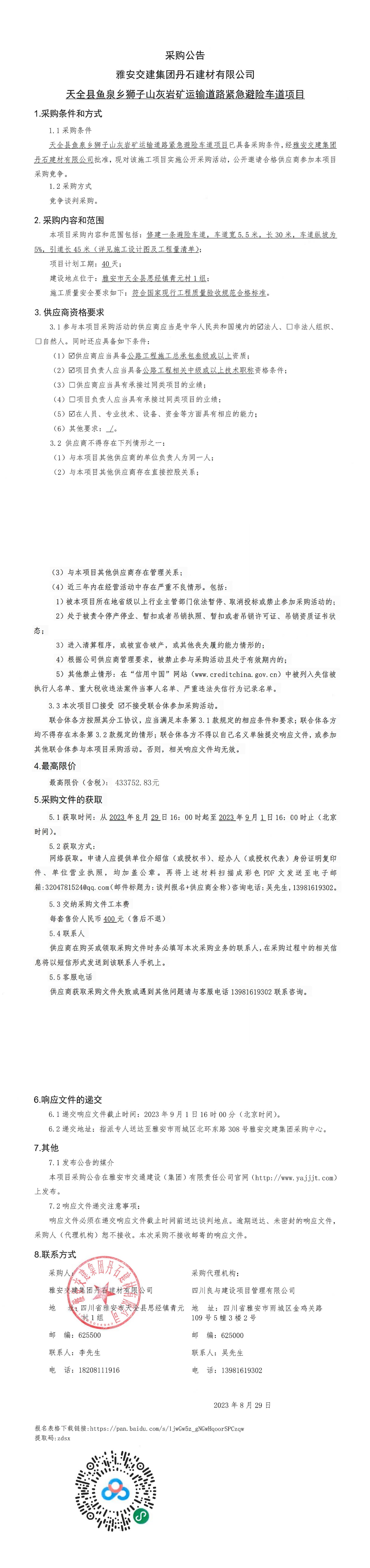 雅安交建集團(tuán)丹石建材有限公司天全縣魚泉鄉(xiāng)獅子山灰?guī)r礦運(yùn)輸?shù)缆肪o急避險車道項(xiàng)目采購公告