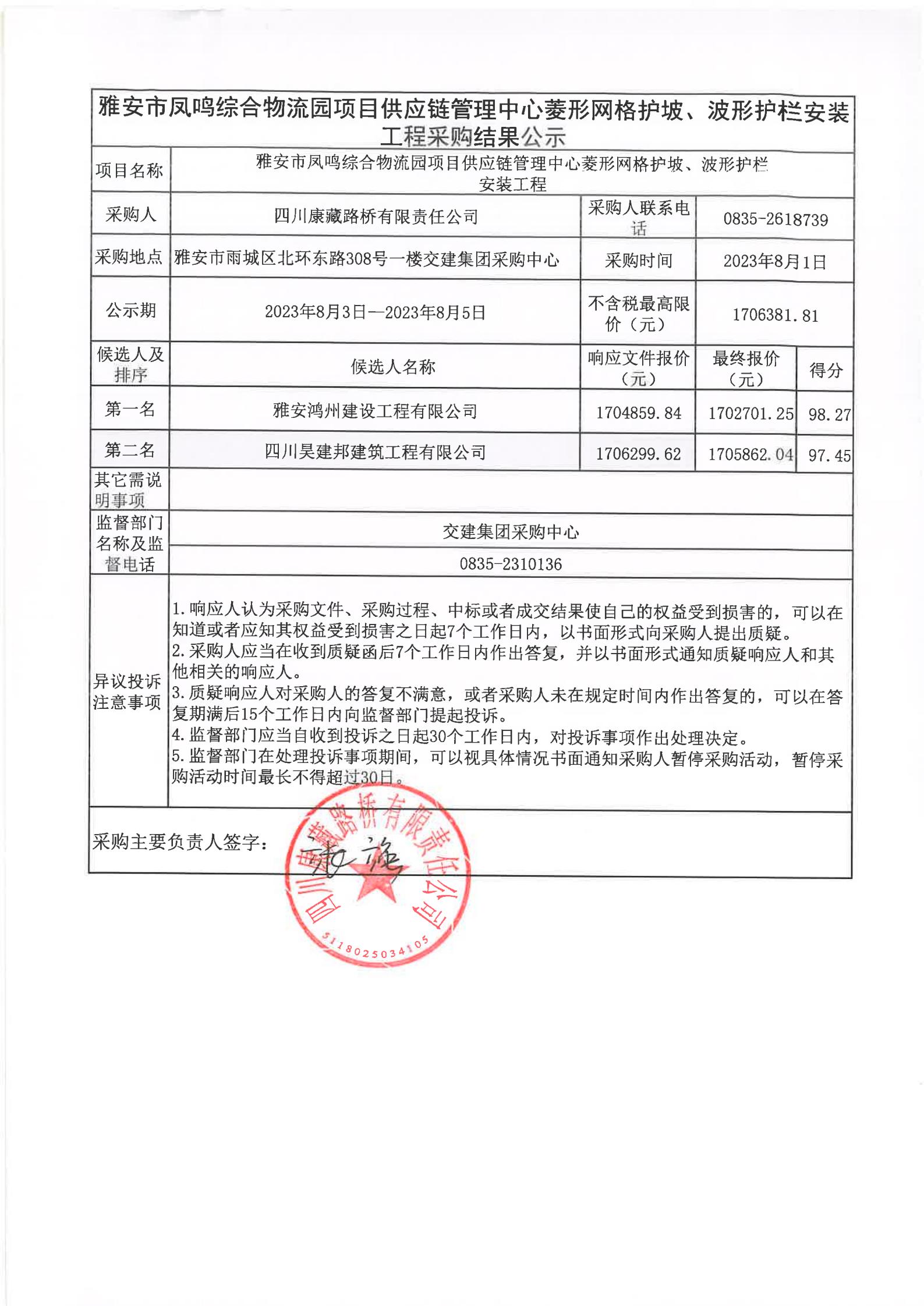 四川康藏路橋有限責(zé)任公司雅安市鳳鳴綜合物流園項目供應(yīng)鏈管理中心菱形網(wǎng)格護(hù)坡、波形護(hù)欄安裝工程采購結(jié)果公示