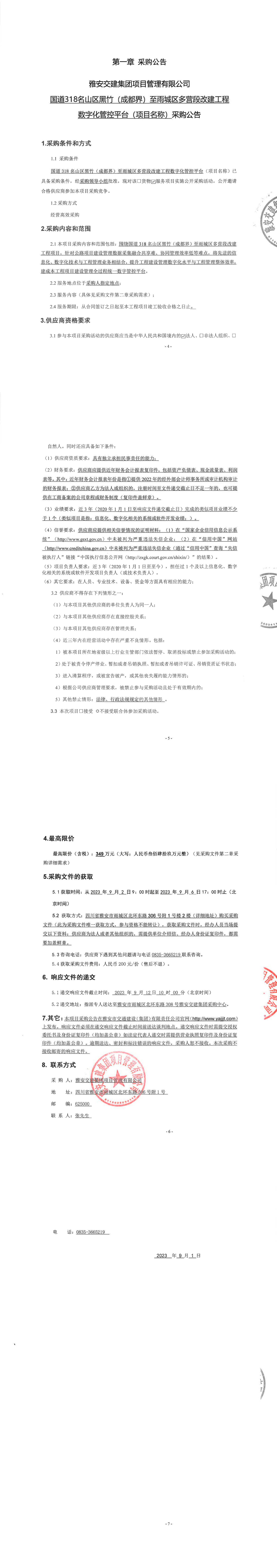 雅安交建集團(tuán)項(xiàng)目管理有限公司國(guó)道318名山區(qū)黑竹(成都界)至雨城區(qū)多營(yíng)段改建工程數(shù)字化管控平臺(tái)(項(xiàng)目名稱)采購(gòu)公告