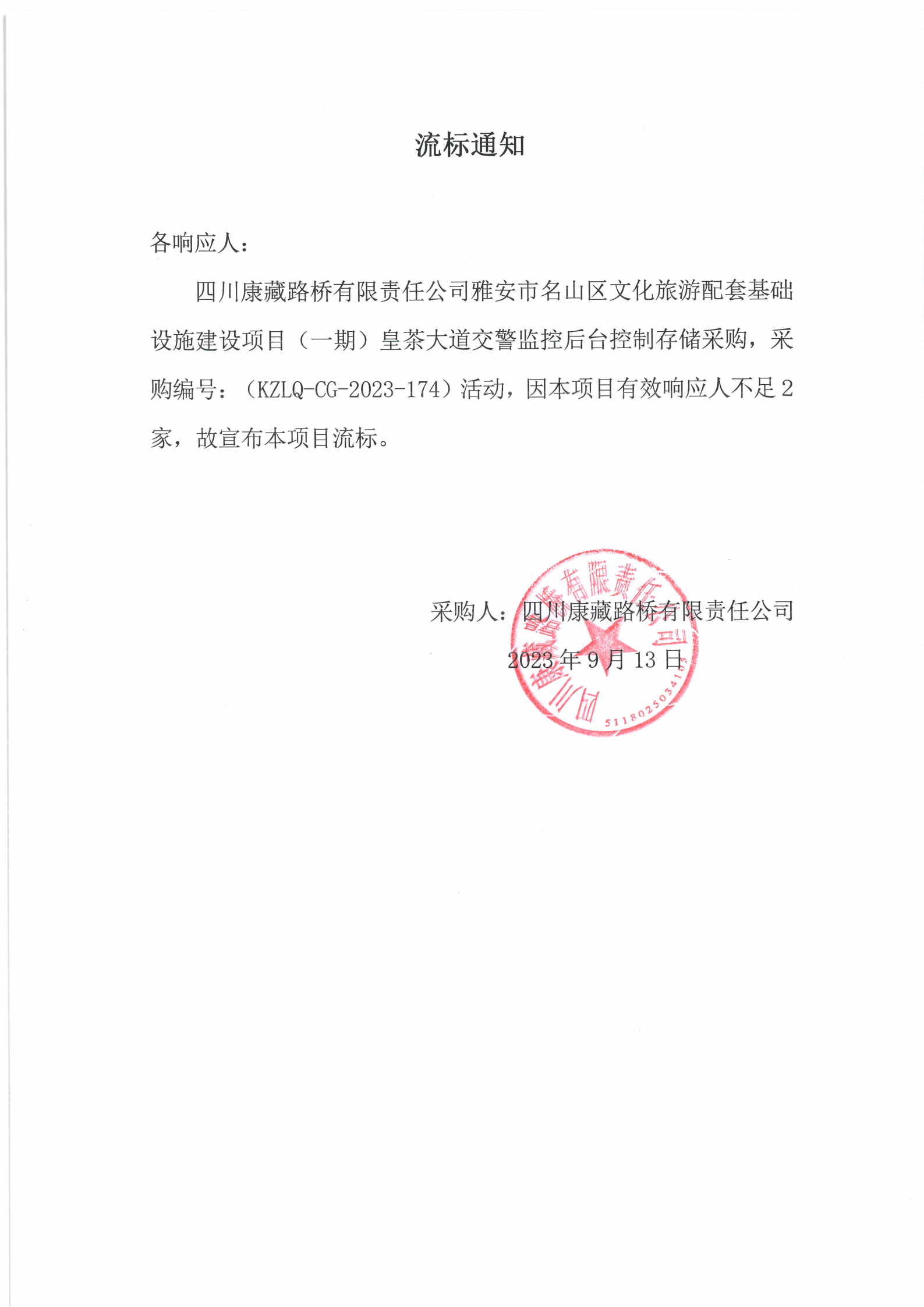 四川康藏路橋有限責(zé)任公司雅安市名山區(qū)文化旅游配套基礎(chǔ)設(shè)施建設(shè)項目(一期)皇茶大道交警監(jiān)控后臺控制存儲采購流標(biāo)通知