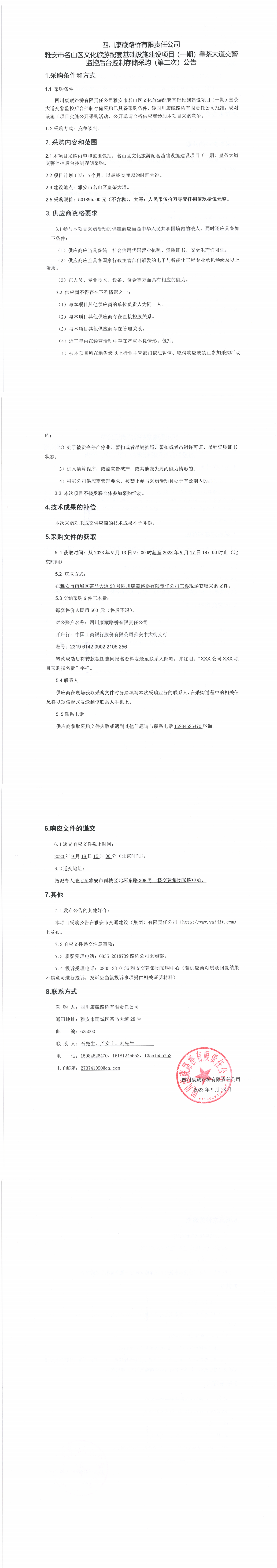 四川康藏路橋有限責任公司雅安市名山區(qū)文化旅游配套基礎設施建設項目(一期)皇茶大道交警監(jiān)控后臺控制存儲采購(第二次)公告