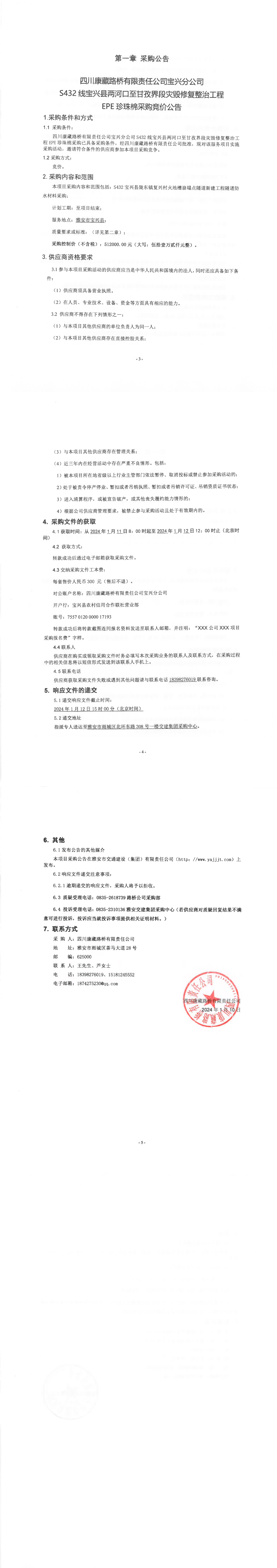 四川康藏路橋有限責(zé)任公司寶興分公司S432線寶興縣兩河口至甘孜界段災(zāi)毀修復(fù)整治工程EPE珍珠棉采購競價公告