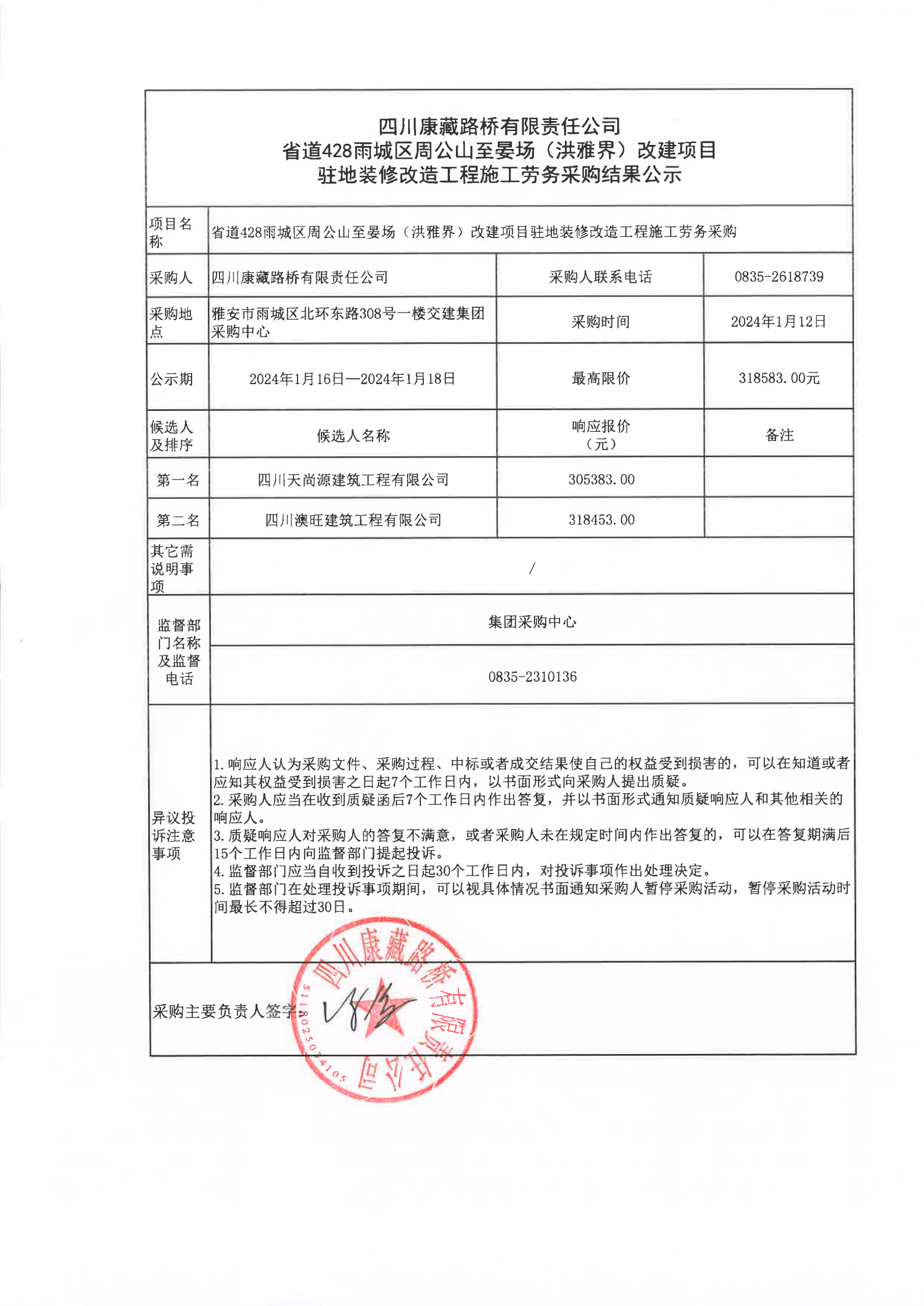 四川康藏路橋有限責(zé)任公司省道428雨城區(qū)周公山至晏場(chǎng)(洪雅界)改建項(xiàng)目駐地裝修改造工程施工勞務(wù)采購結(jié)果公示