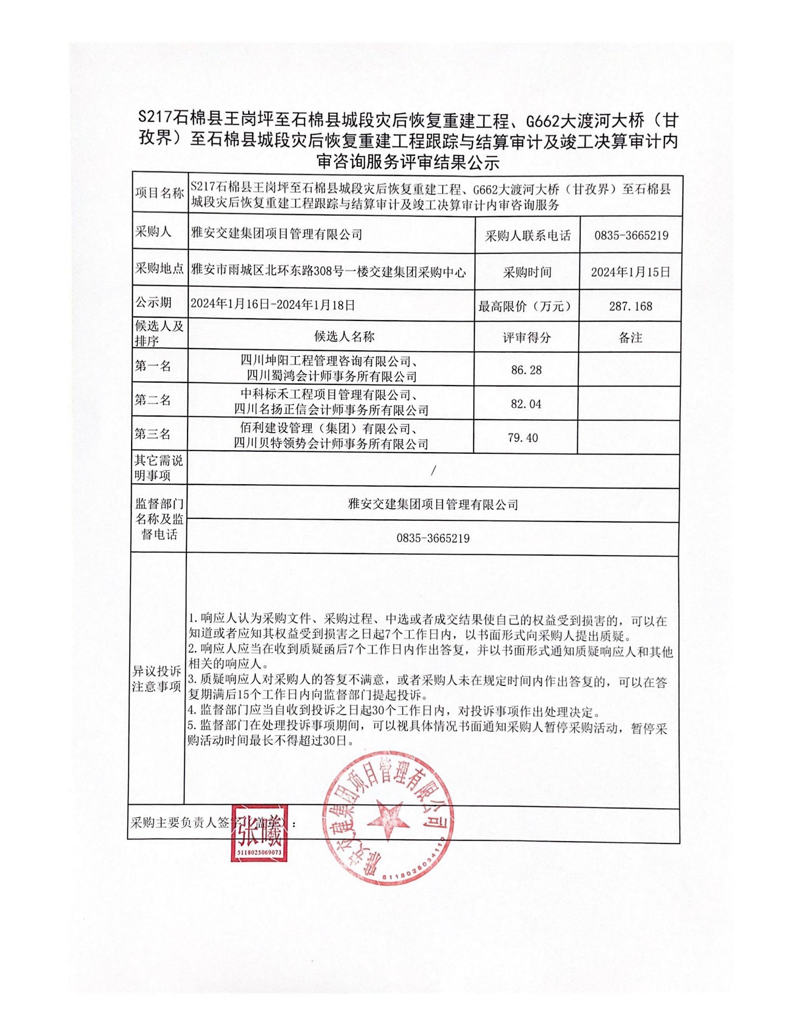 雅安交建集團項目管理有限公司S217石棉縣王崗坪至石棉縣城段災(zāi)后恢復(fù)重建工程、G662大渡河大橋(甘孜界)至石棉縣城段災(zāi)后恢復(fù)重建工程跟蹤與結(jié)算審計及竣工決算審計內(nèi)審咨詢服務(wù)評審結(jié)果公示