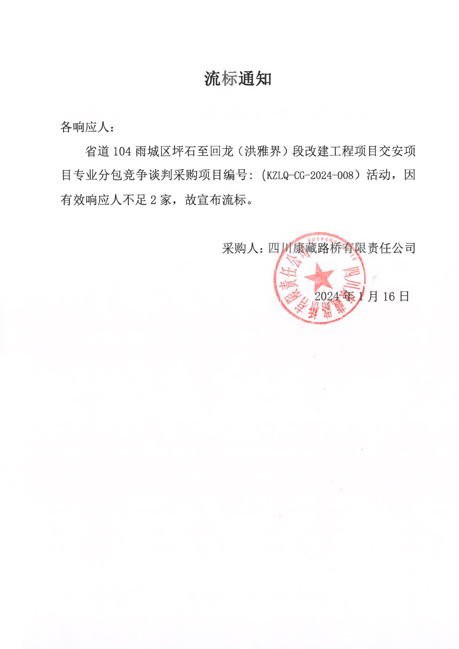 四川康藏路橋有限責(zé)任公司省道104雨城區(qū)坪石至回龍(洪雅界)段改建工程項(xiàng)目交安項(xiàng)目專業(yè)分包競(jìng)爭(zhēng)談判采購(gòu)流標(biāo)通知