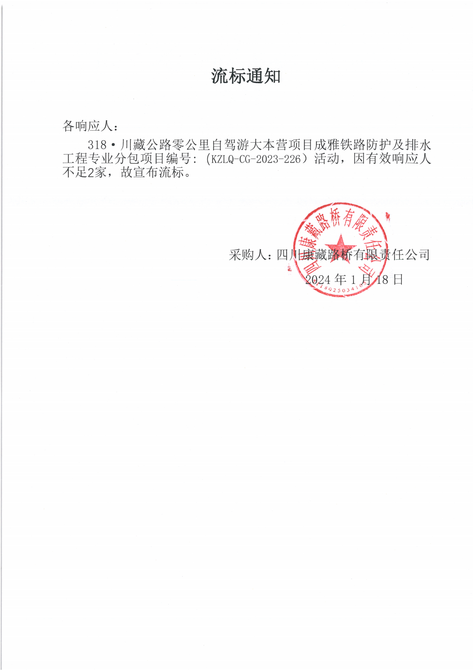 四川康藏路橋有限責(zé)任公司318·川藏公路零公里自駕游大本營(yíng)項(xiàng)目成雅鐵路防護(hù)及排水工程專業(yè)分包項(xiàng)目流標(biāo)通知