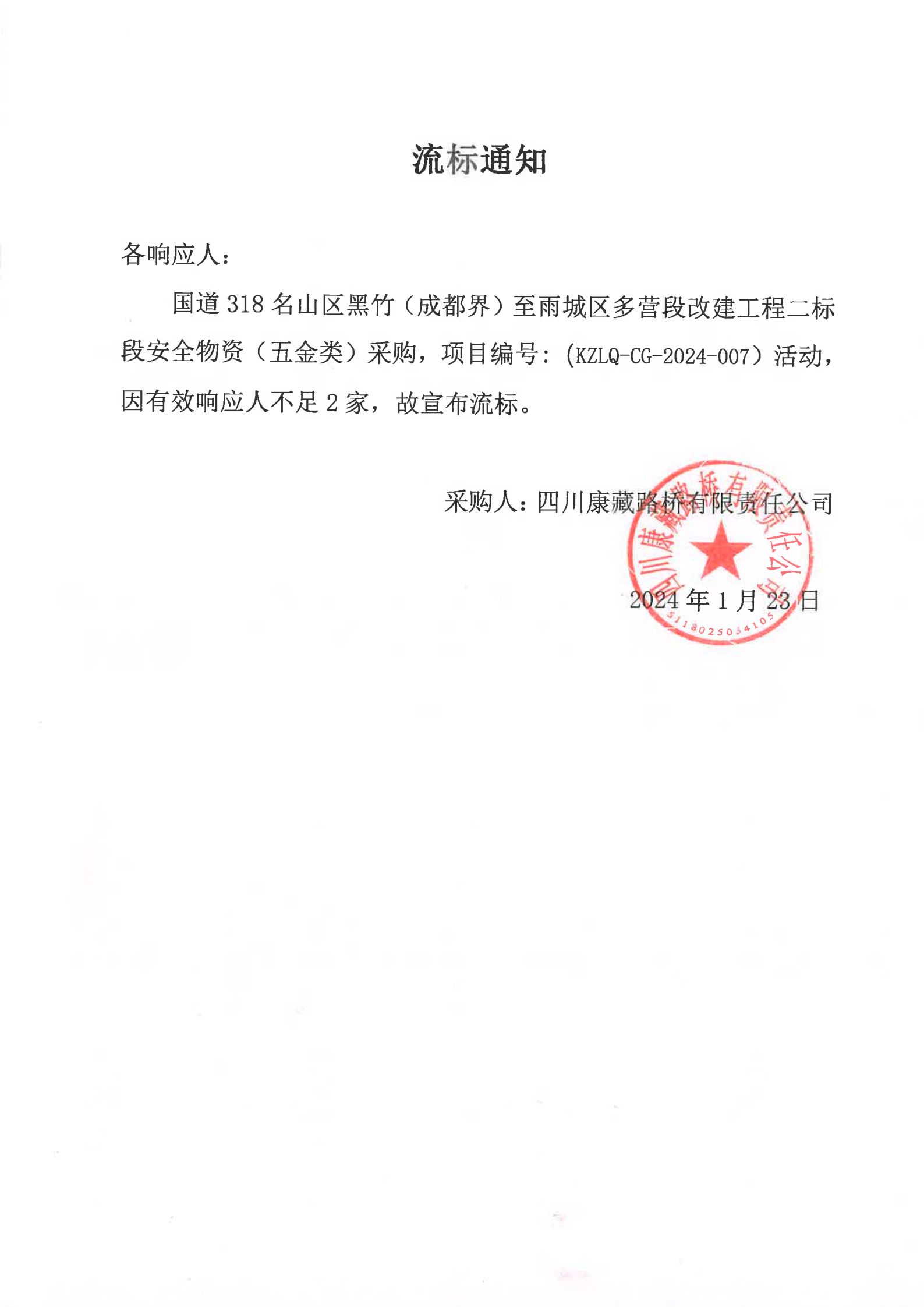 四川康藏路橋有限責(zé)任公司國(guó)道318名山區(qū)黑竹(成都界)至雨城區(qū)多營(yíng)段改建工程二標(biāo)段安全物資(五金類(lèi))采購(gòu)流標(biāo)通知