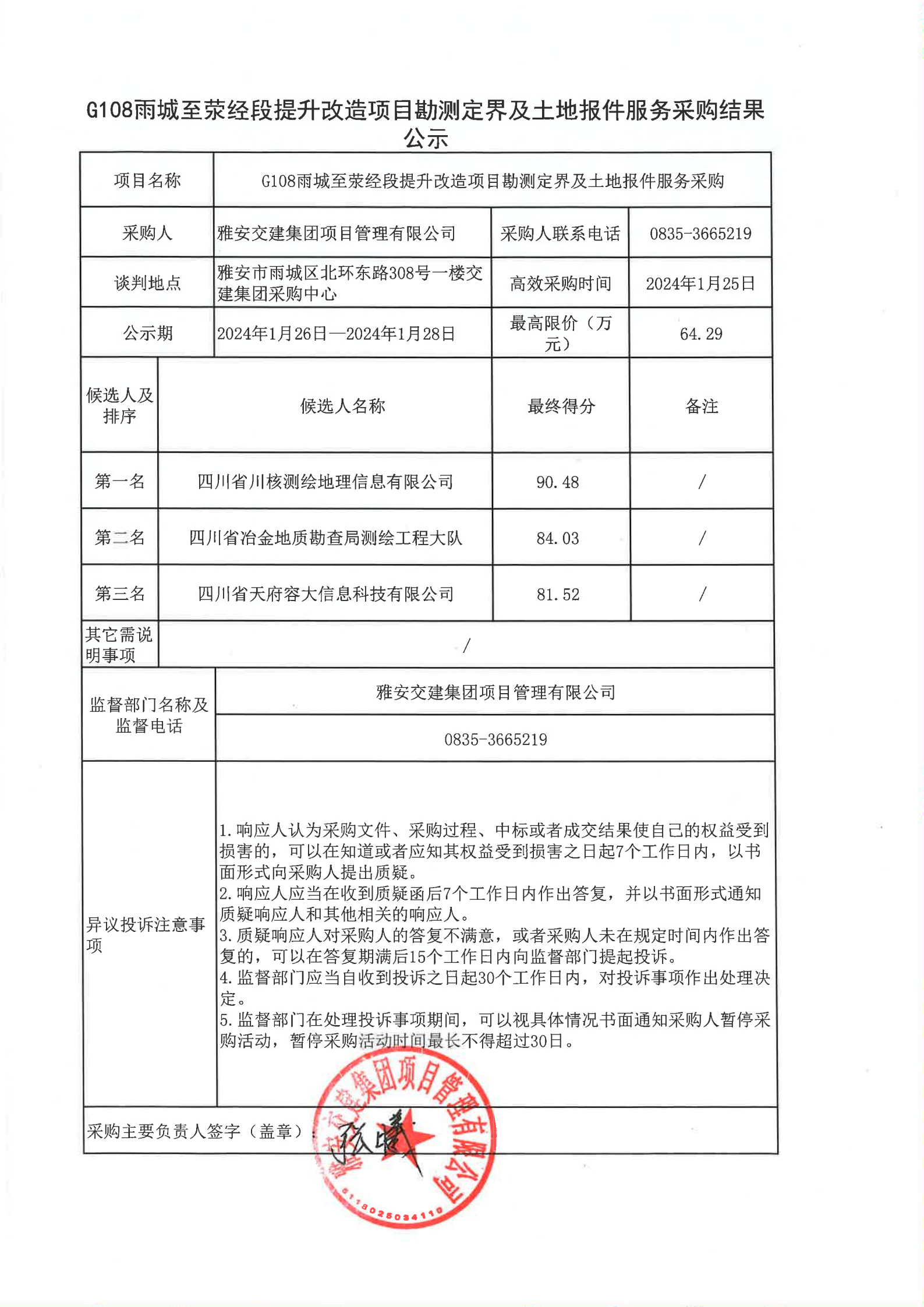 四川康藏路橋有限責任公司G108雨城至滎經(jīng)段提升改造項目勘測定界及土地報件服務采購結(jié)果公示