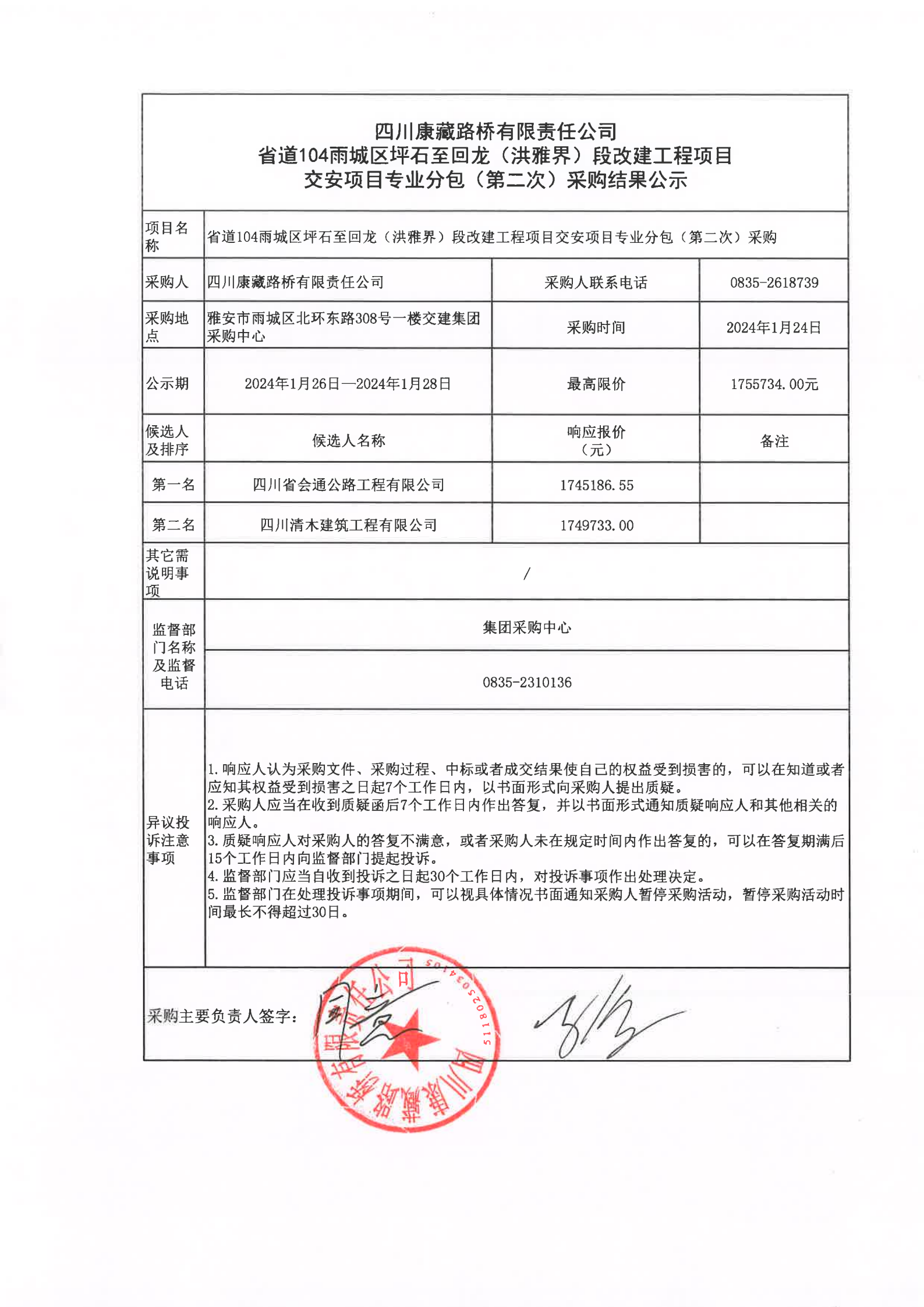 四川康藏路橋有限責任公司省道104雨城區(qū)坪石至回龍(洪雅界)段改建工程項目交安項目專業(yè)分包(第二次)采購結(jié)果公示