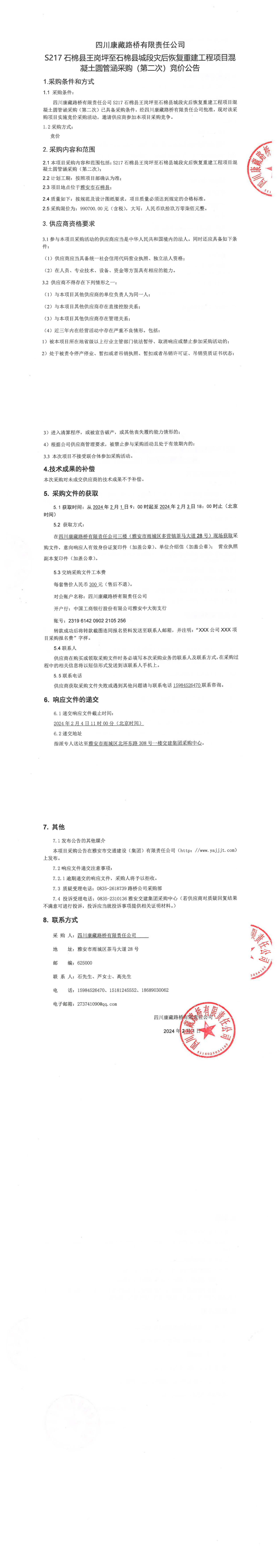 四川康藏路橋有限責任公司S217石棉縣王崗坪至石棉縣城段災(zāi)后恢復(fù)重建工程項目混凝土圓管涵采購(第二次)競價公告