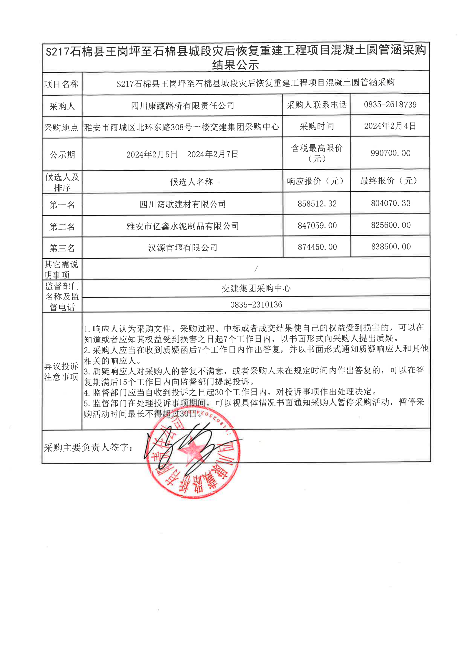 四川康藏路橋有限責(zé)任公司S217石棉縣王崗坪至石棉縣城段災(zāi)后恢復(fù)重建工程項(xiàng)目混凝土圓管涵采購結(jié)果公示