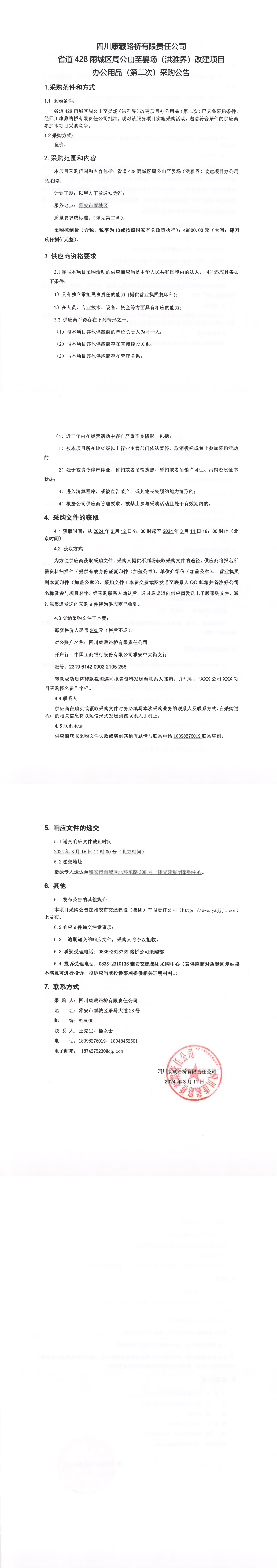 四川康藏路橋有限責任公司省道428雨城區(qū)周公山至晏場(洪雅界)改建項目辦公用品(第二次)采購公告