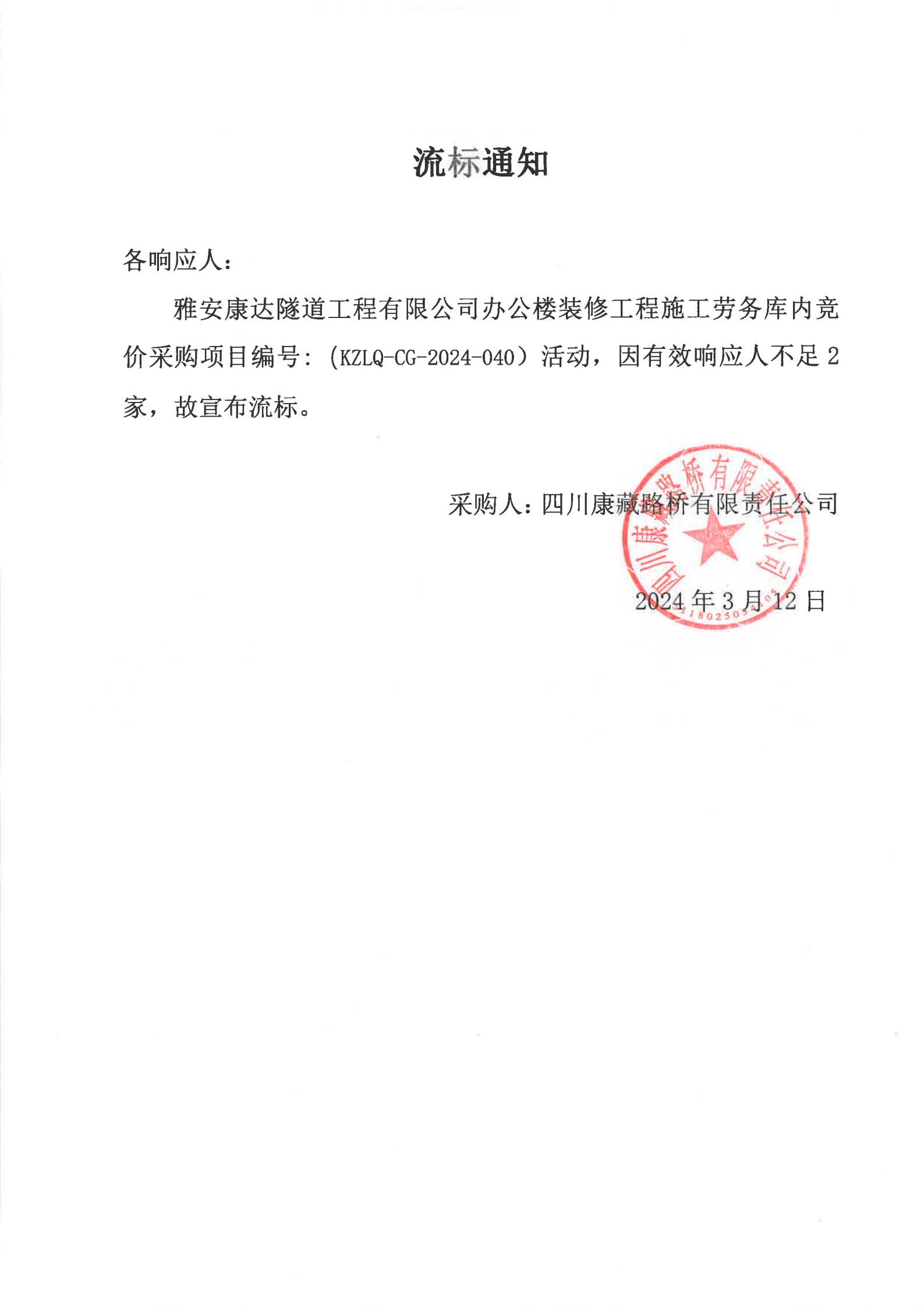 雅安康達隧道工程有限公司辦公樓裝修工程施工勞務庫內(nèi)競價采購流標通知