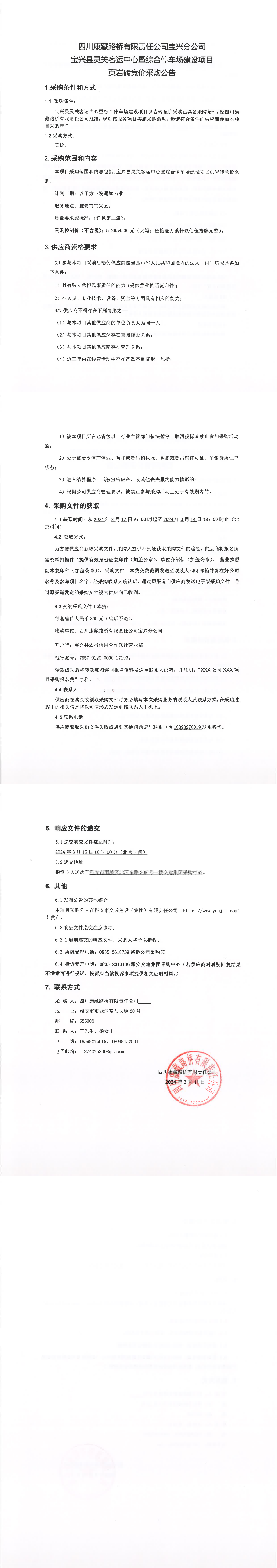四川康藏路橋有限責(zé)任公司寶興縣靈關(guān)客運(yùn)中心暨綜合停車場建設(shè)項(xiàng)目頁巖磚競價(jià)采購公告